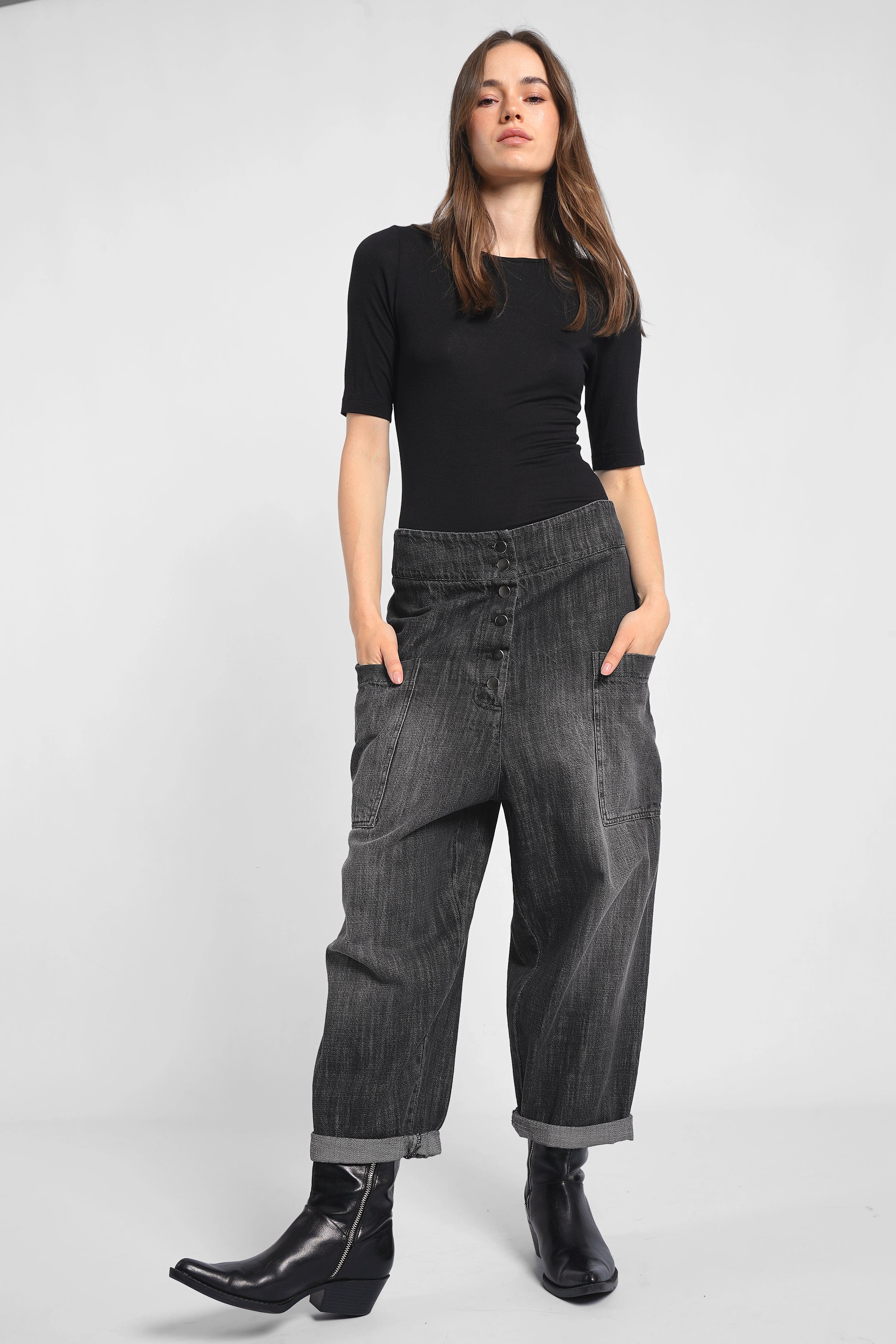 Gefertigt aus strukturierter Baumwolle mit Denim-Charakter – leicht im Tragegefühl und weich im Griff. Die Hose zeigt eine weite Silhouette, veredelt durch den Gradient Wash. Der tiefe Schritt und die markante Knopfleiste setzen ein klares Statement und verstärken den lässigen Ausdruck.