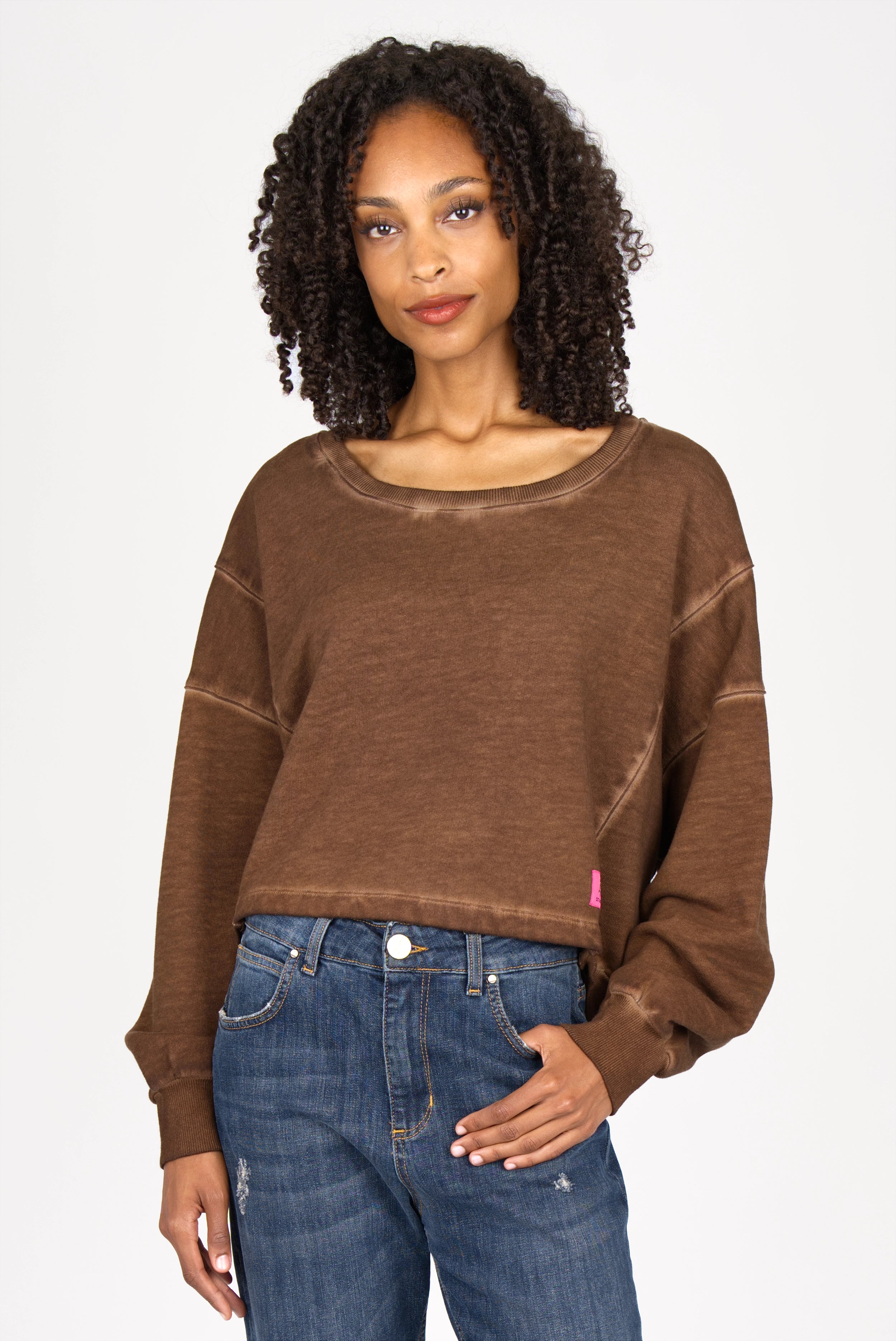 Verkürzte Länge trifft auf entspannte Weite: Dieser Sweater aus cold-washed Baumwoll-Sweat kombiniert eine oversized Passform mit cropped Schnitt. U-Boot-Ausschnitt, überschnittene Schultern und die hinten leicht verlängerte Form sorgen für lässige Proportionen.