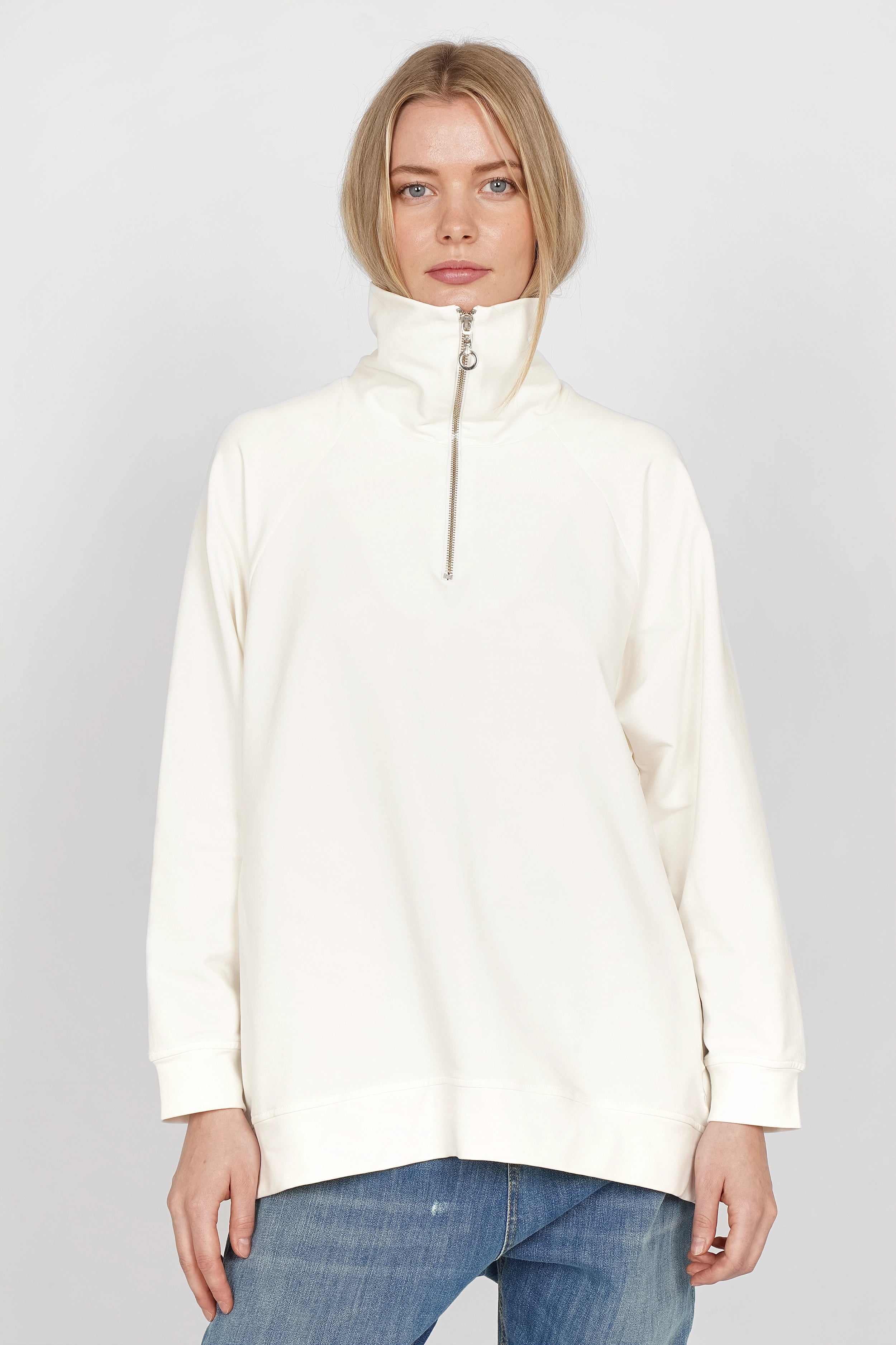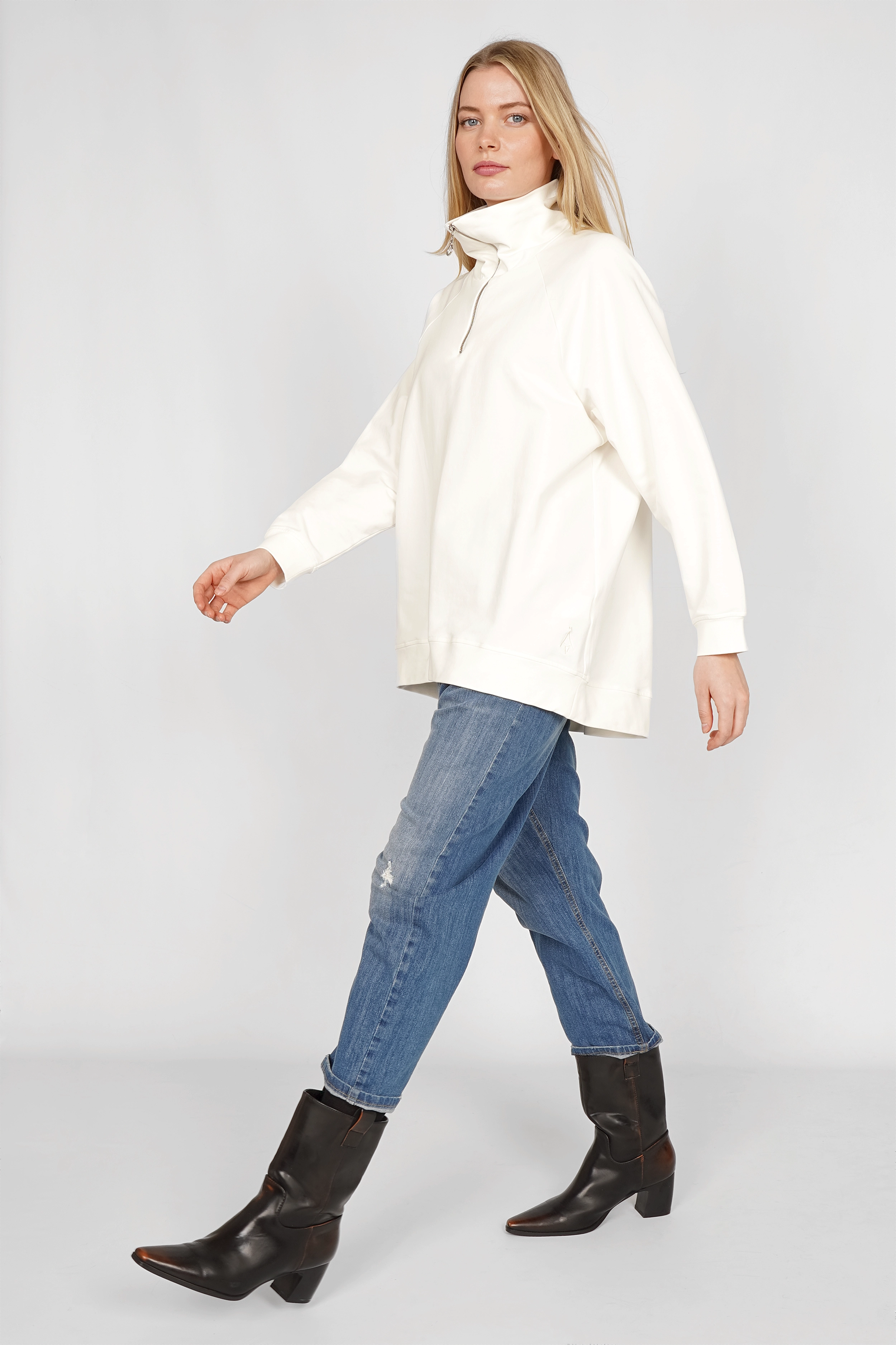 Ein modernes Key Piece: lässig, weich, modern. Der Sweater mit leichter A-Linie und längerem Rückteil sorgt für eine entspannte, fließende Silhouette. Der Stoff liegt angenehm auf der Haut, ist leicht zu tragen und dezent mit einer tonalen Logo-Stickerei veredelt. Die Raglanärmel gehen weich in die Schulter über und betonen den natürlichen Fall. Der halbe Metallzipper verleiht dem Design eine sportive Note.