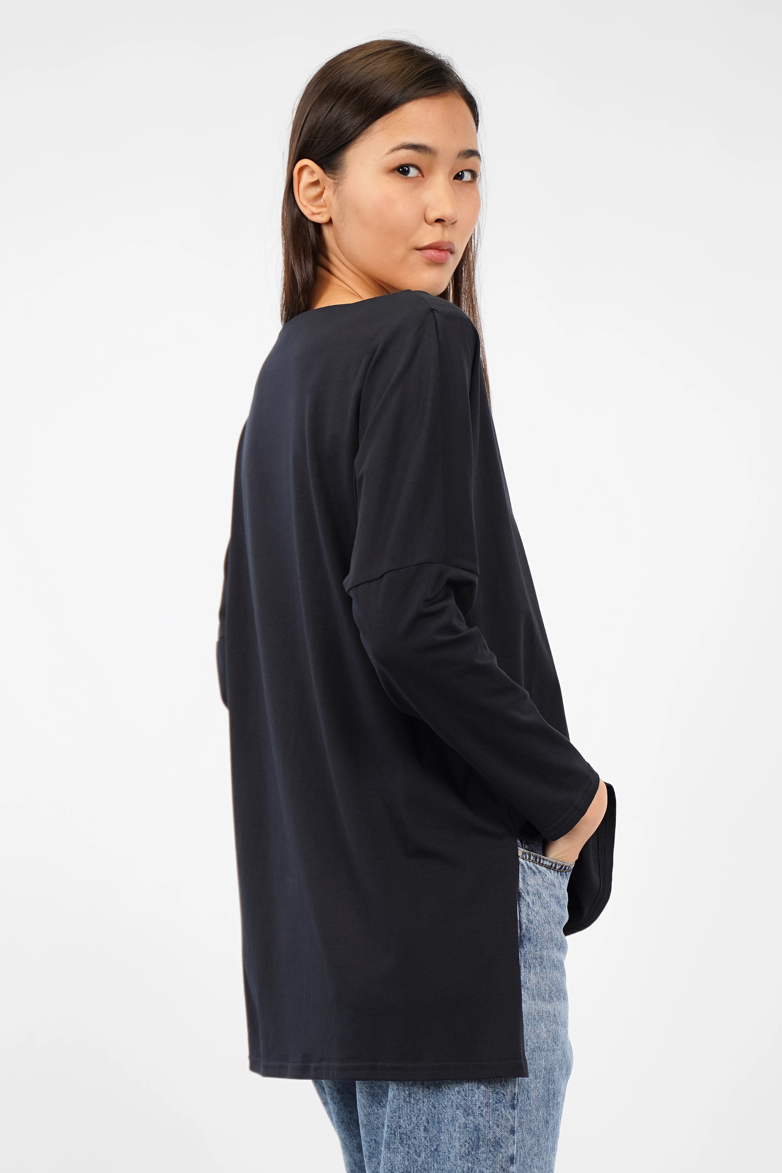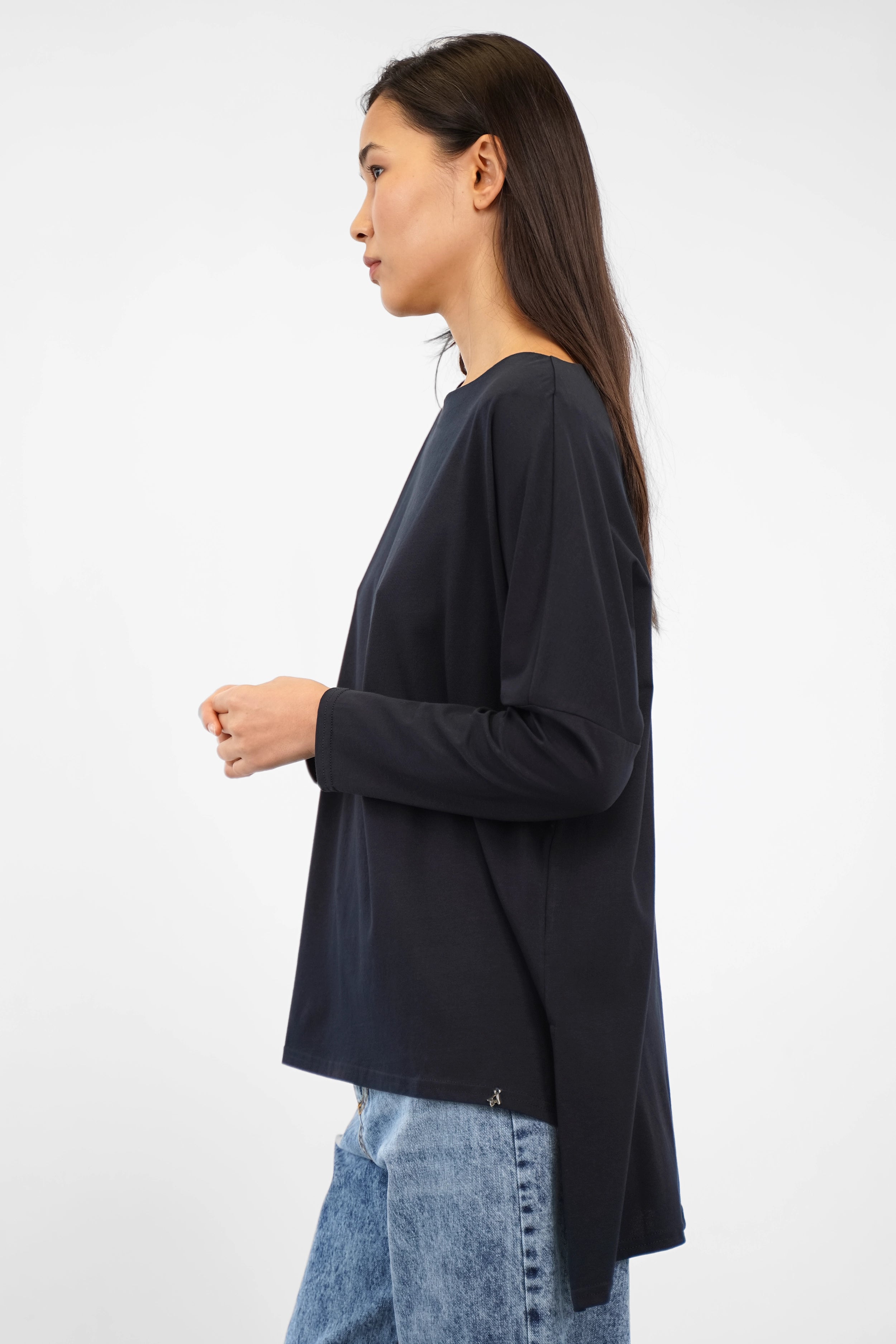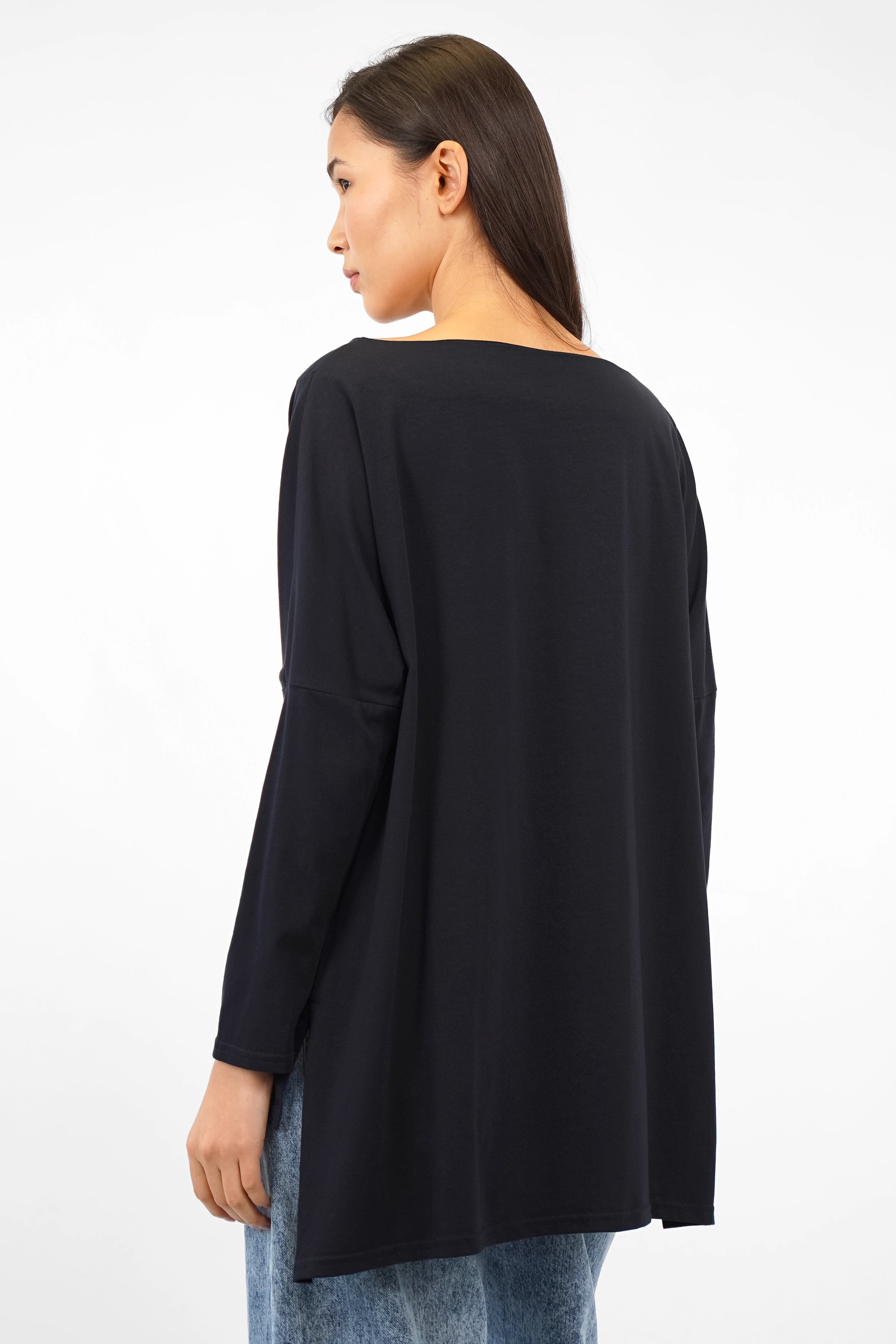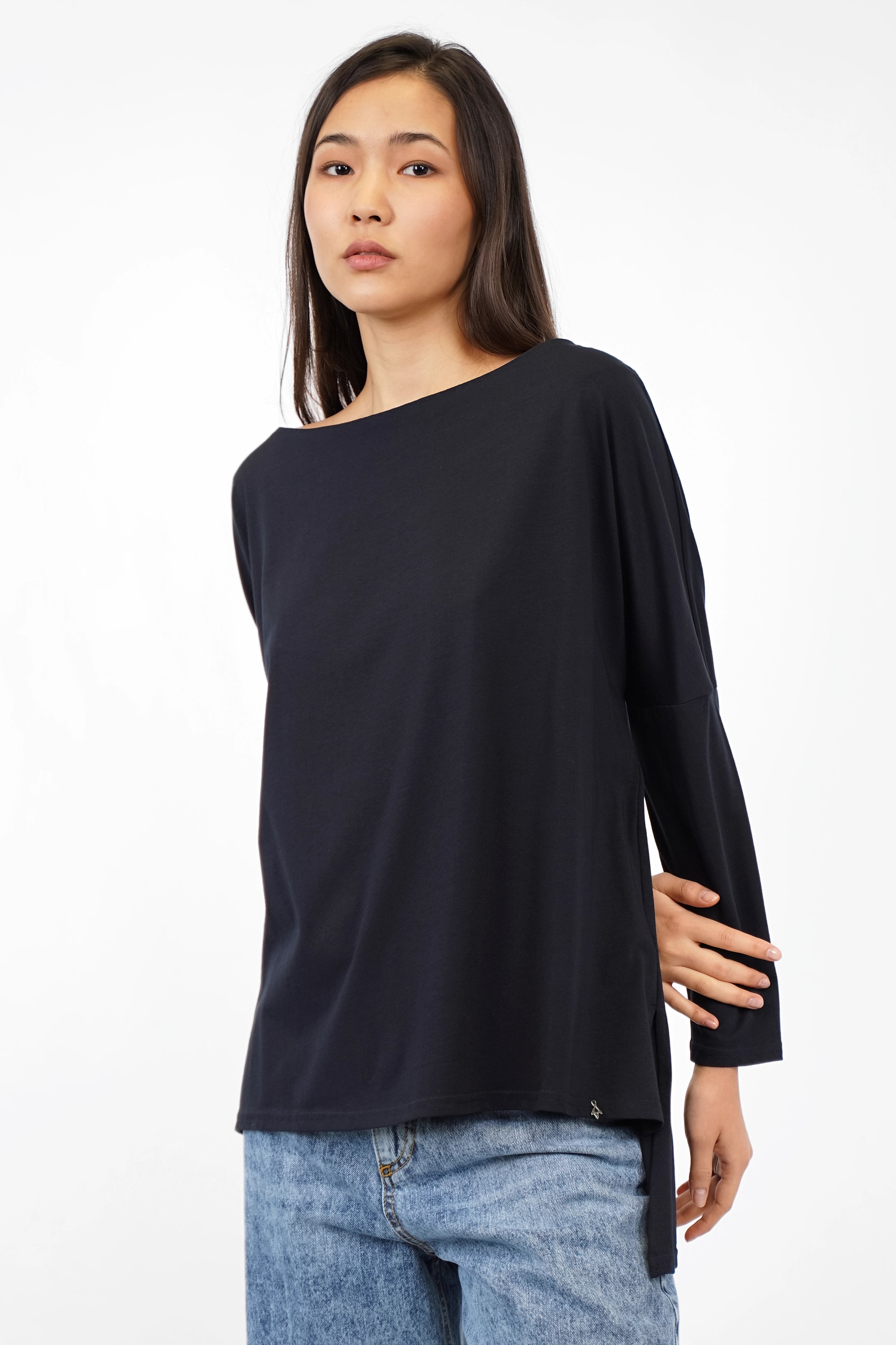 Loose-fitting long sleeve top made of soft cotton jersey with a boat neckline, dropped shoulders and an extended back hem with side slits.