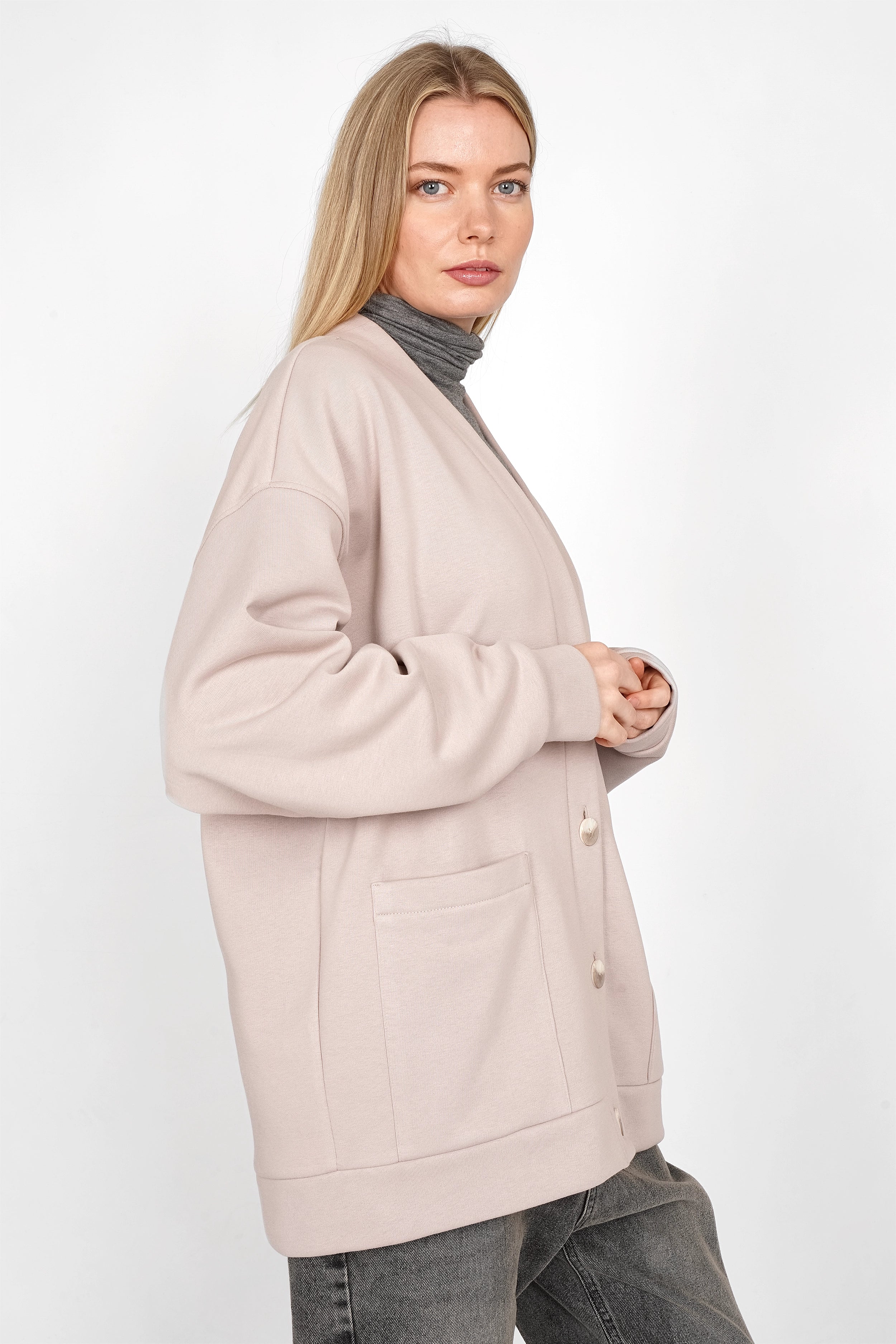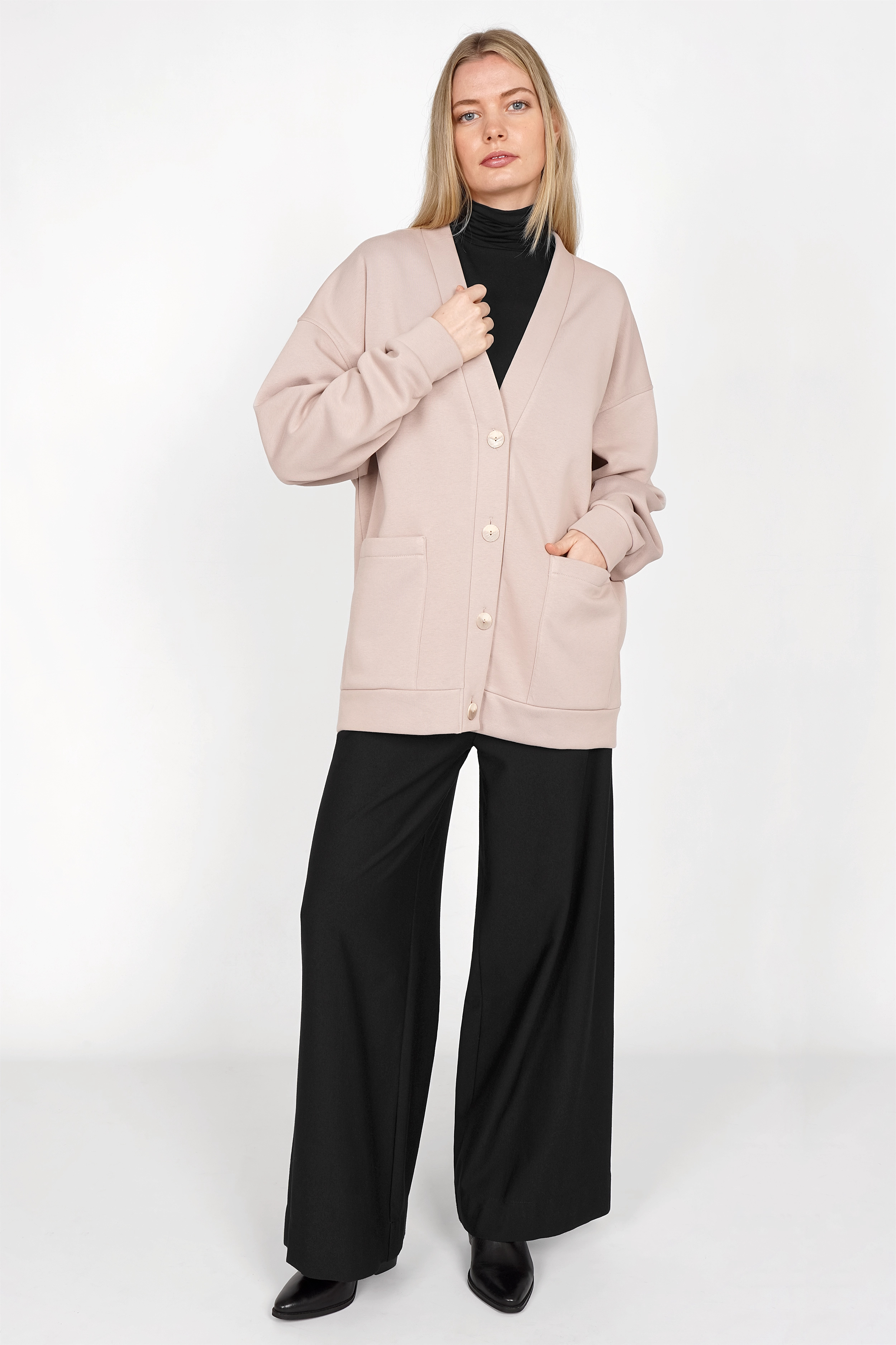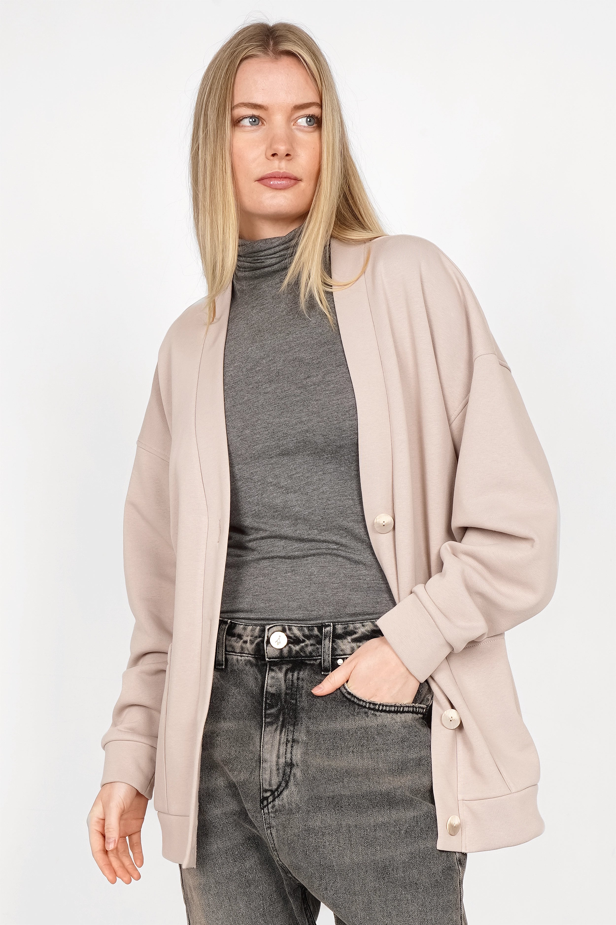 A relaxed fit cardigan made of soft sweat with a relaxed line. The simple shape is characterized by a V-neckline, button placket and large patch pockets. The brushed inside makes it comfortable to wear. Can be worn open or closed - solo or as a layer.