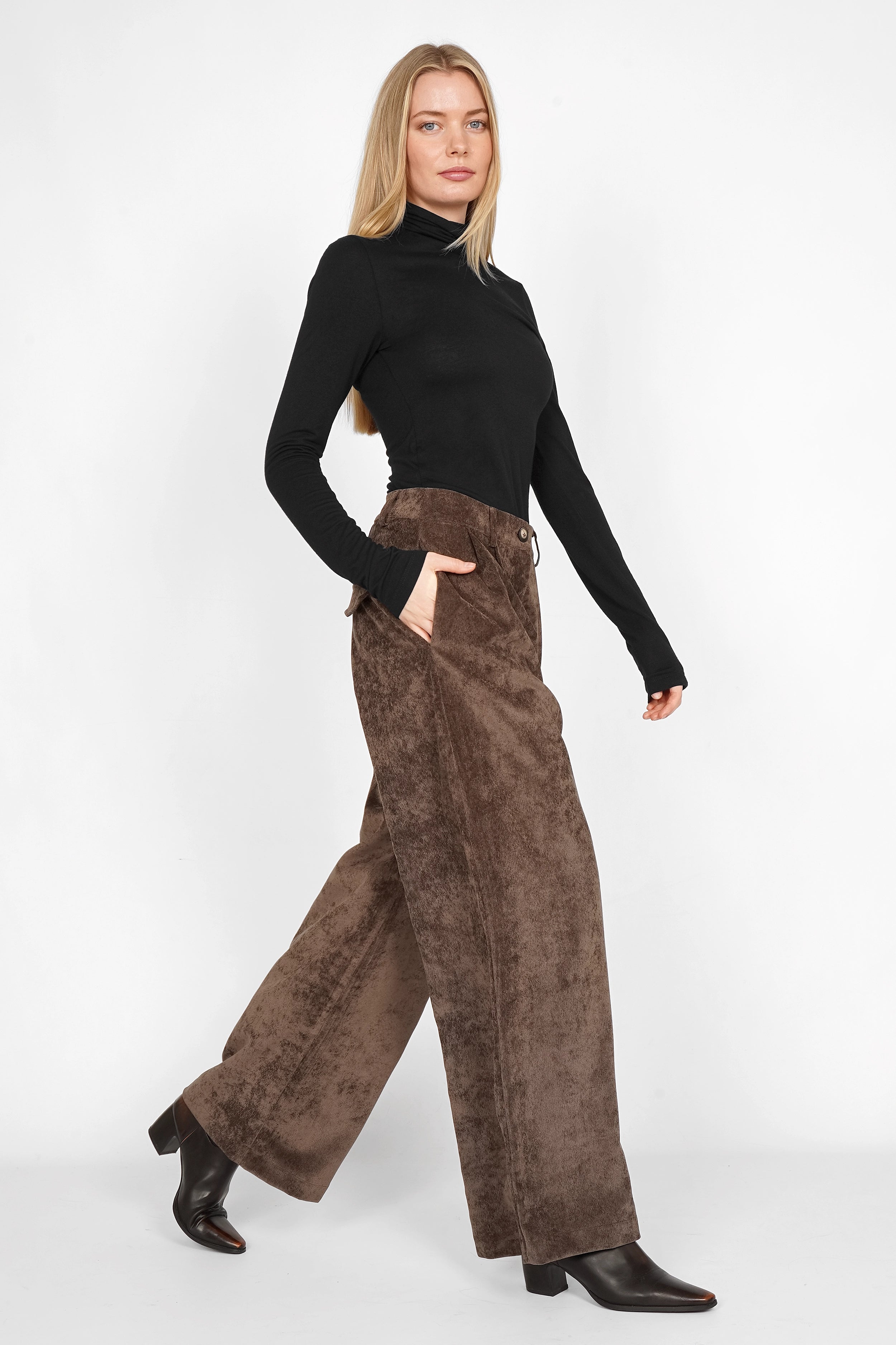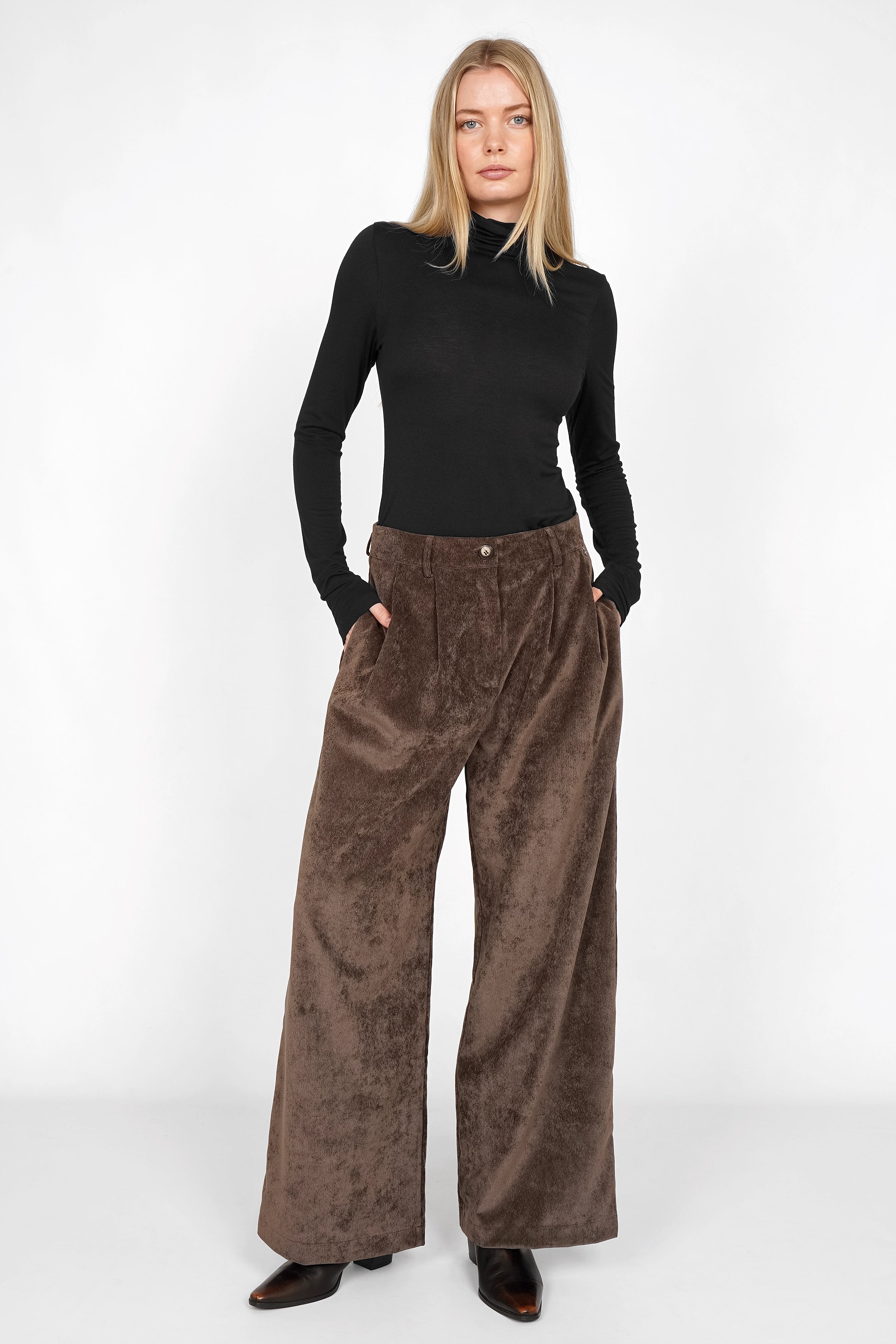 High-waist trousers made from soft corduroy fabric. The wide leg and subtle pleats create a modern, relaxed silhouette that is extremely comfortable to wear. Practical slit pockets at the front and an indicated back pocket round off the design.