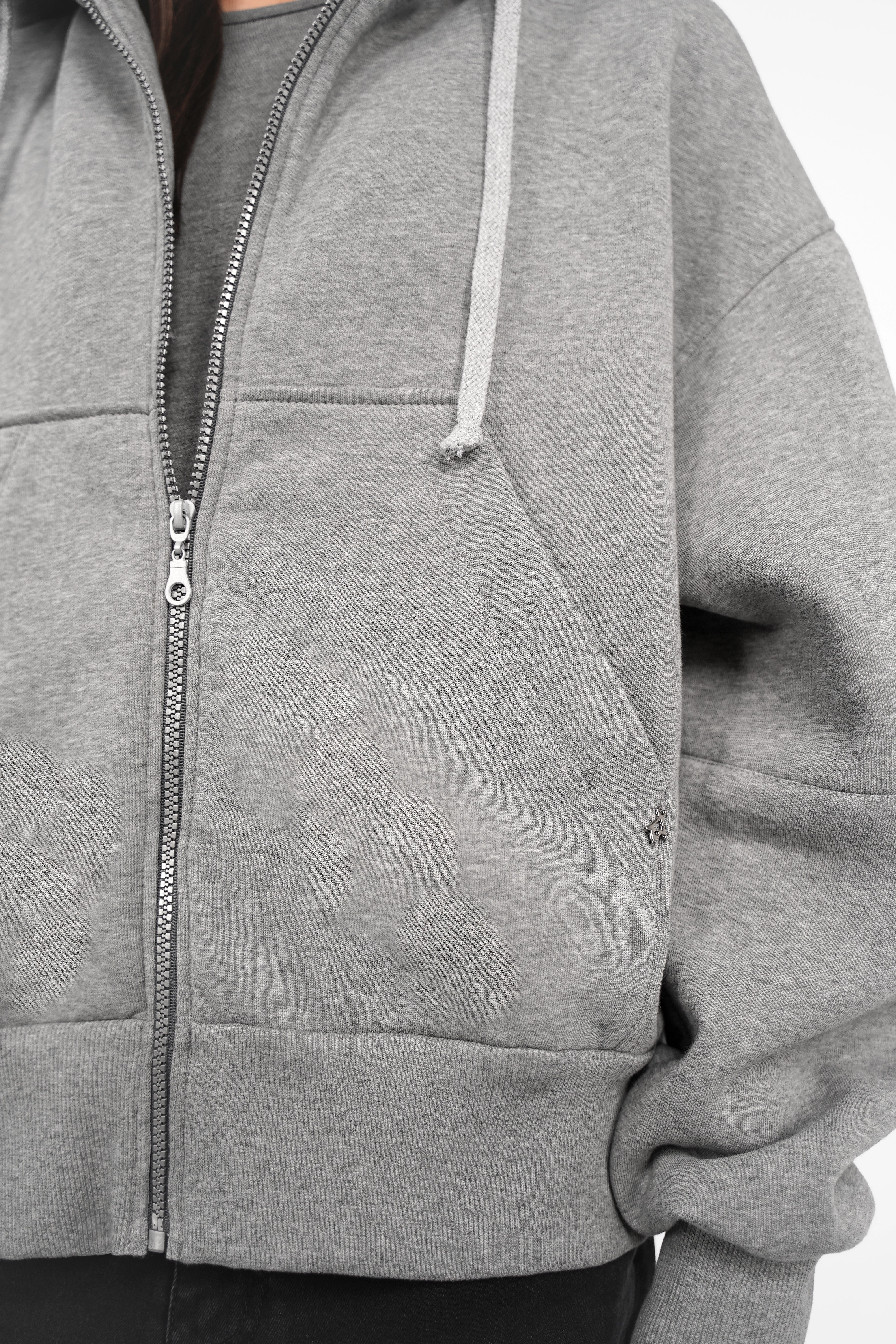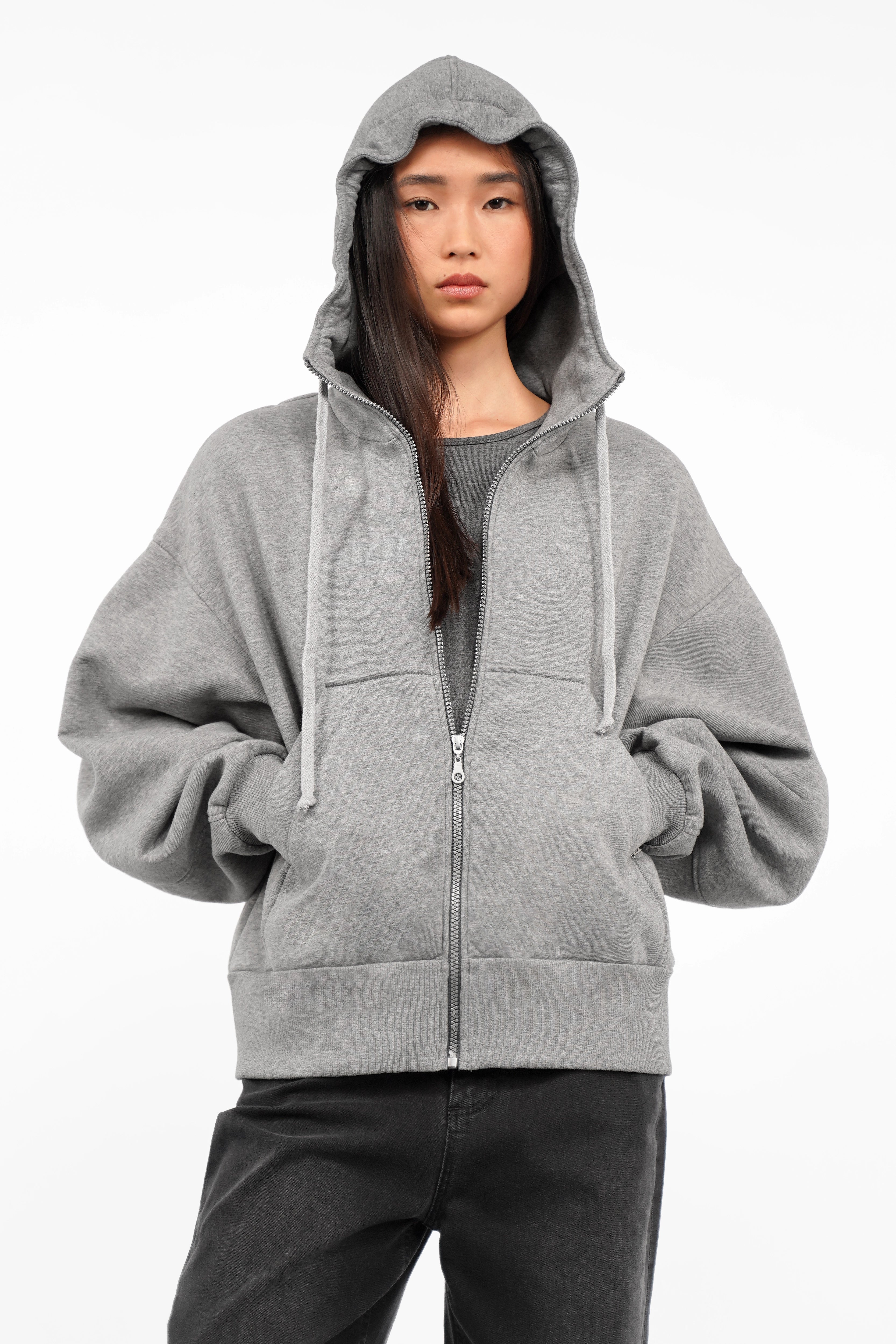 A zipped hoodie with a relaxed fit. Dropped shoulders and voluminous Sakeia-sleeves with wide ribbed cuffs give it a distinctive shape.