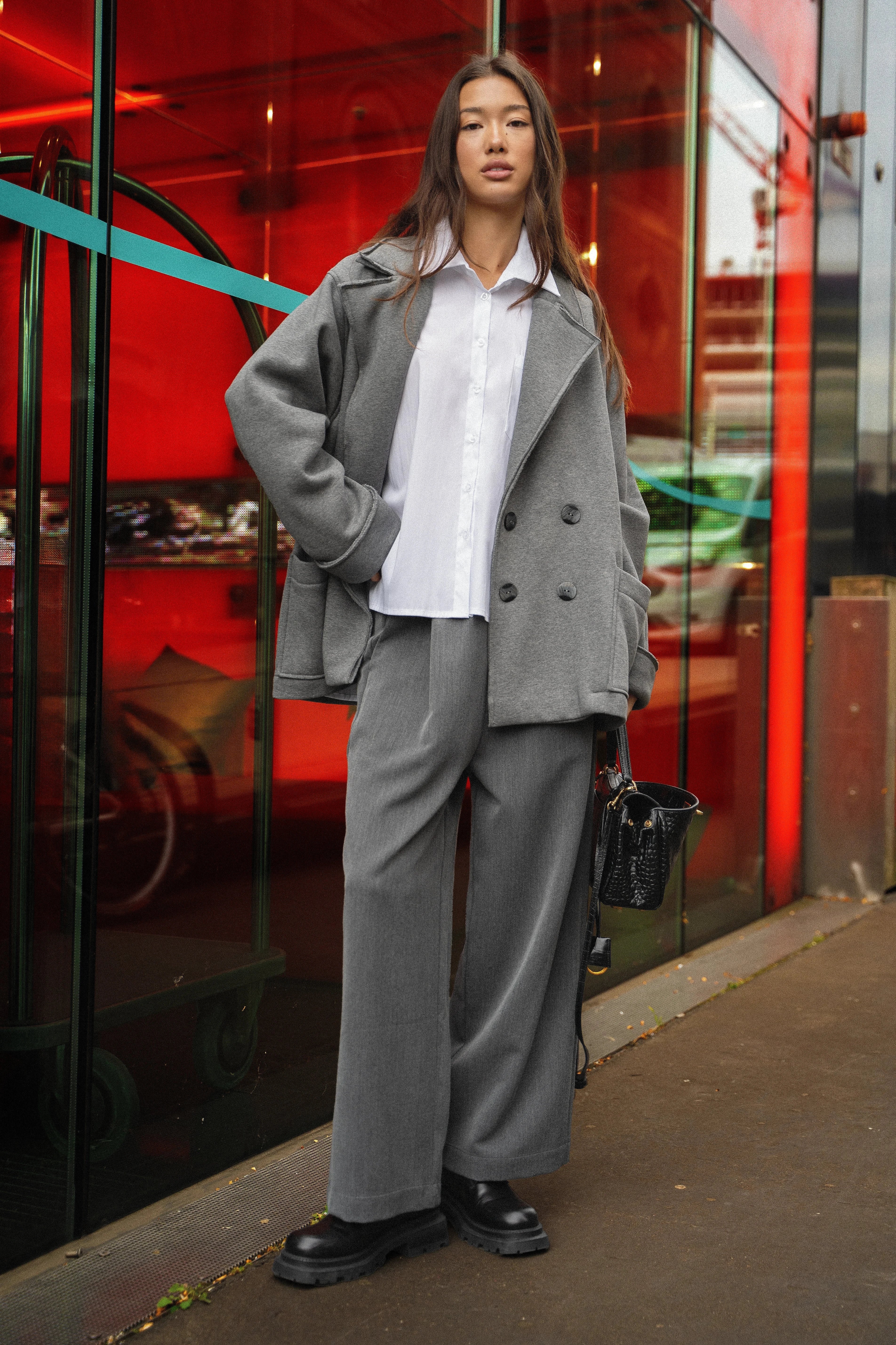 This oversized short coat made from soft jersey has a brushed inside. It features a lapel collar, two double-breasted buttons and large patch pockets. Open cut edges characterize the design. The sleeves can be turned up - the inside is smooth so that no brushed inside is visible when they are turned up.