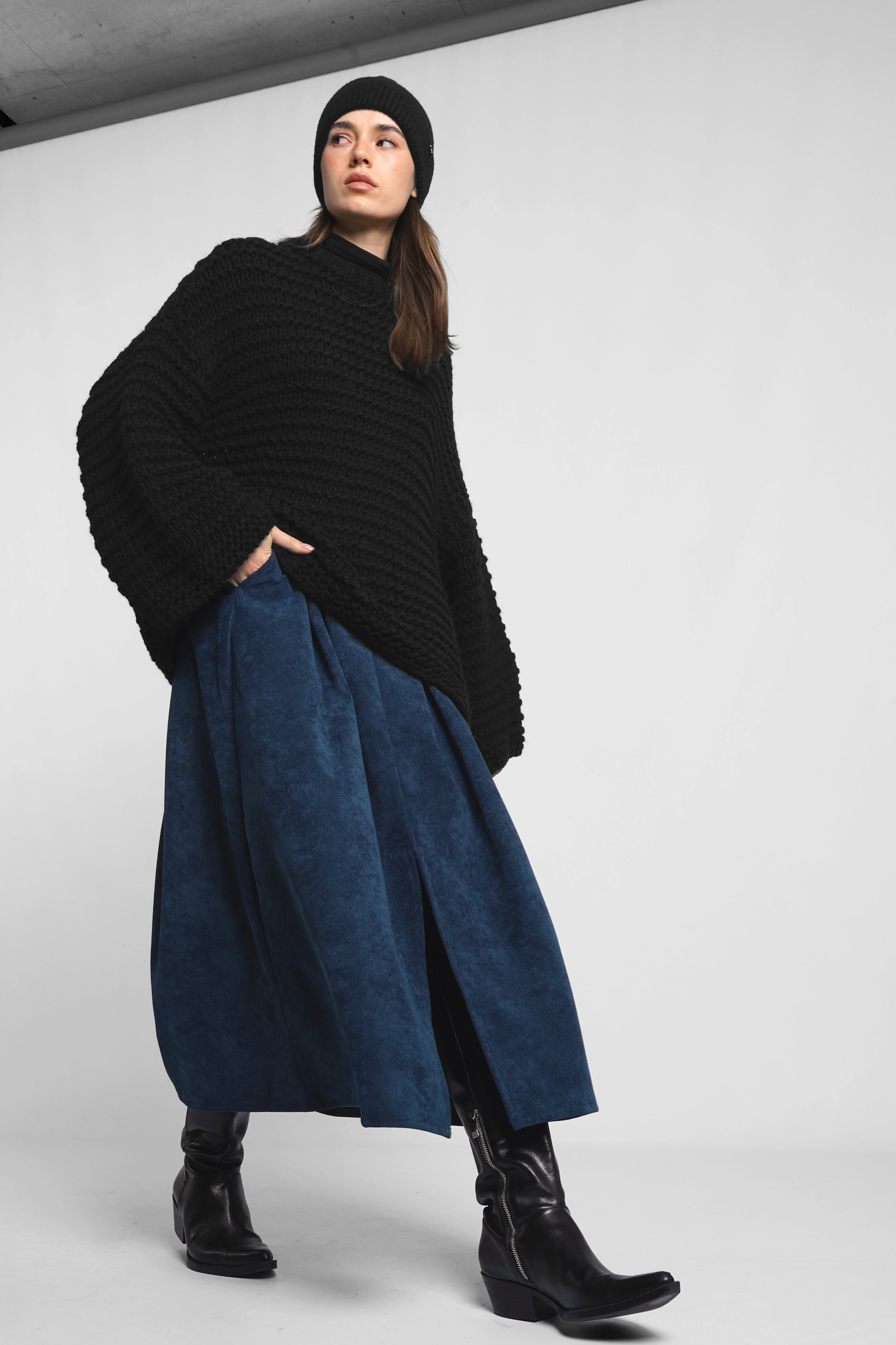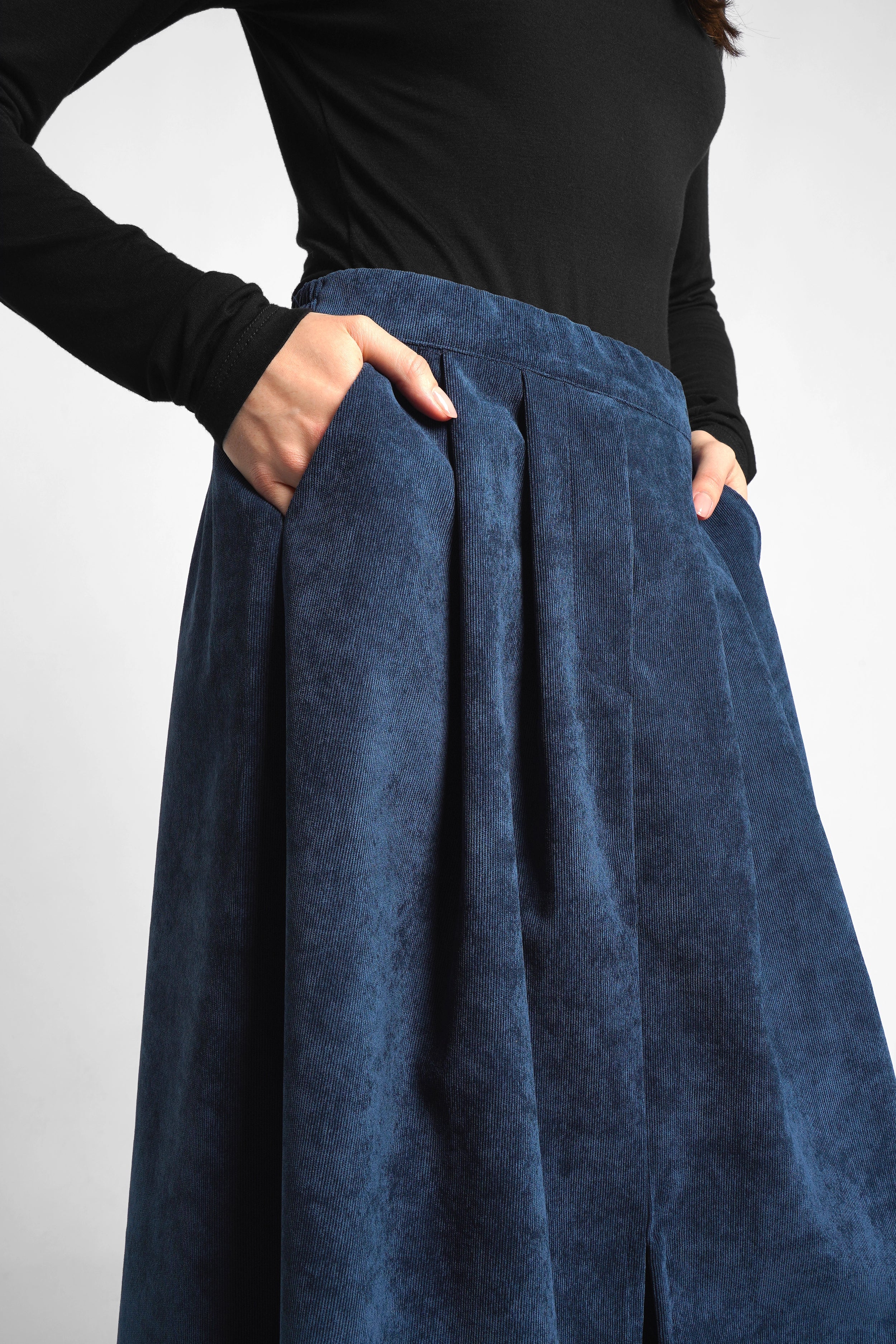 A-line midi skirt made of soft corduroy fabric. With pleats, side pockets slit pockets and front slit.