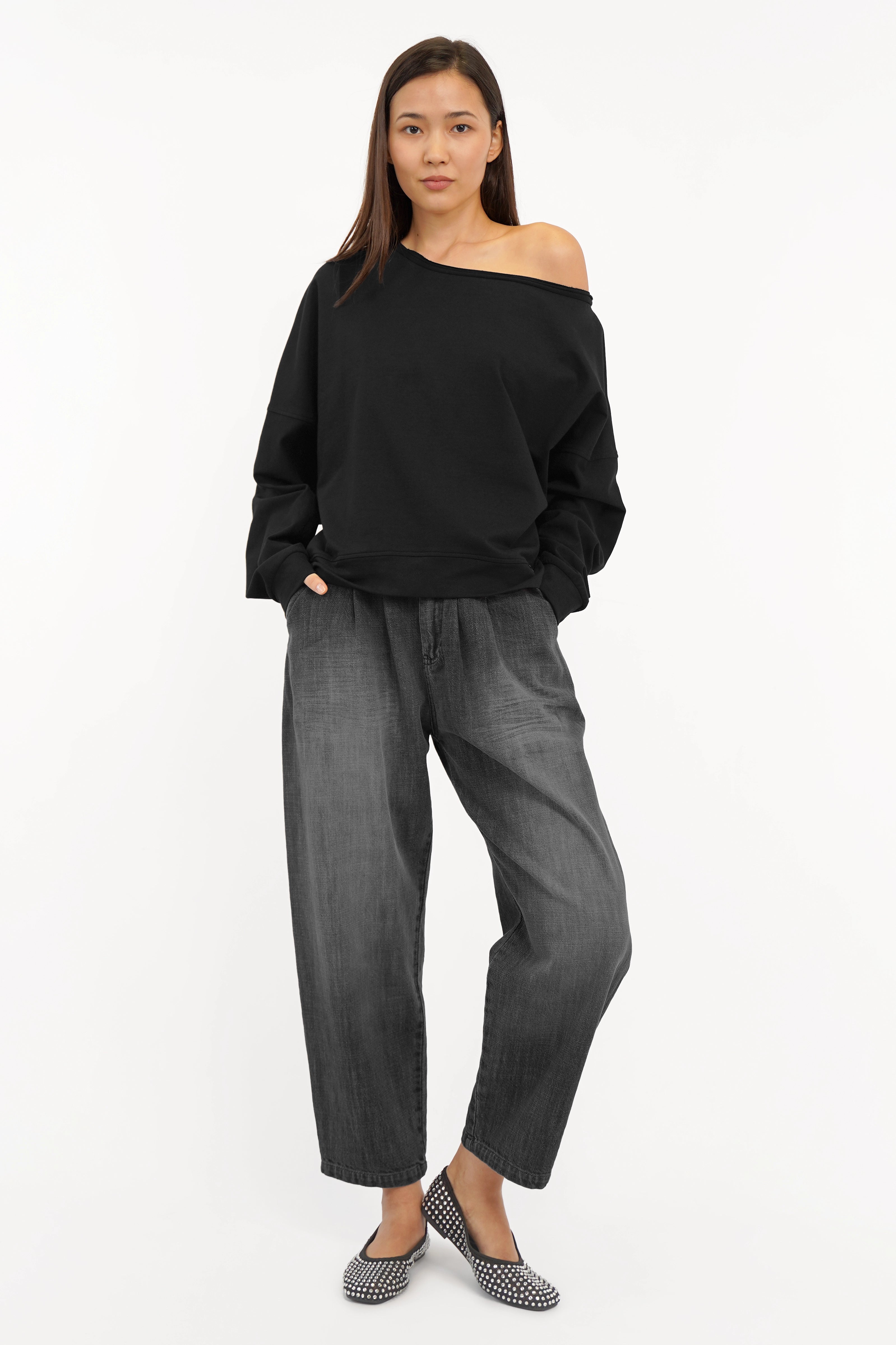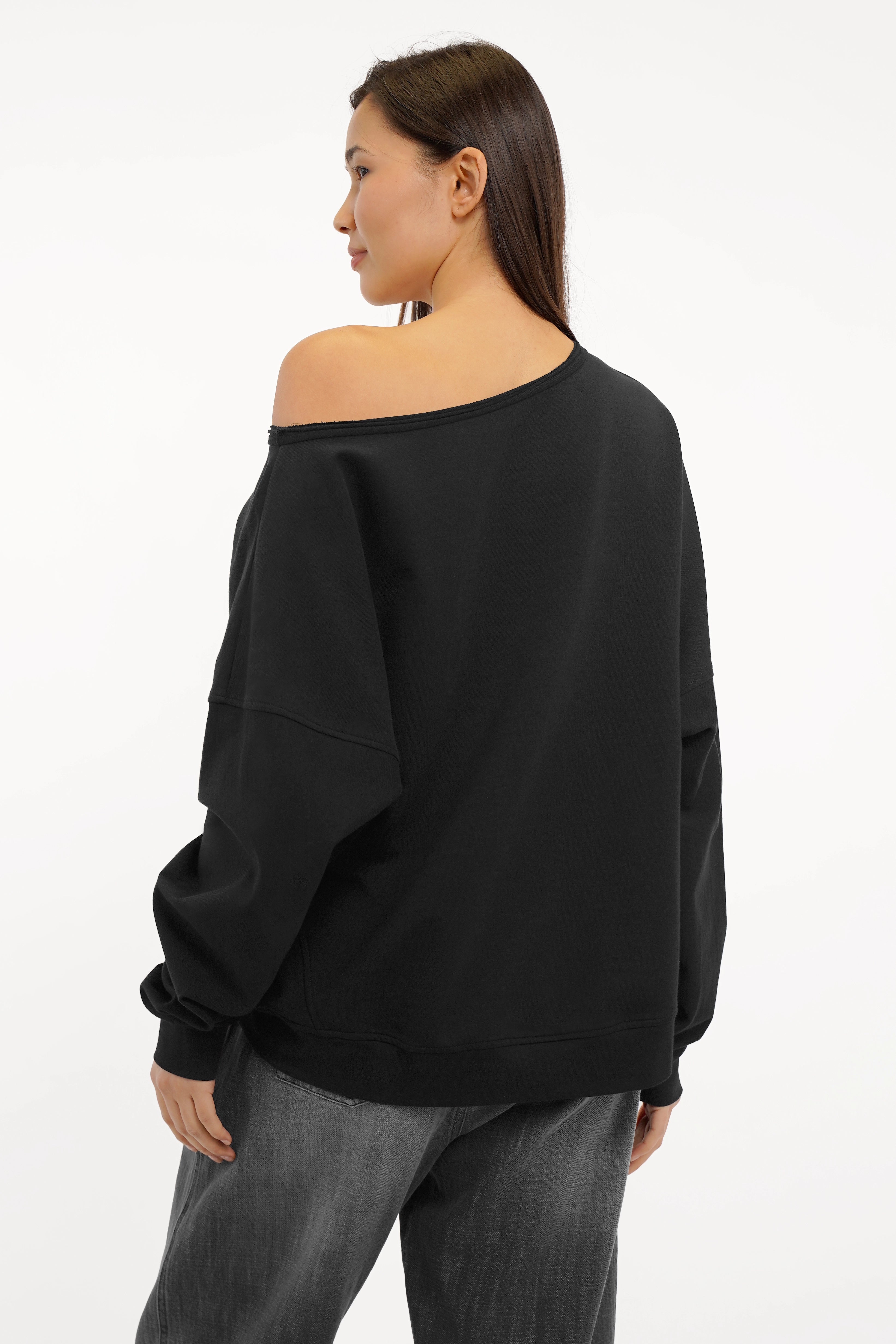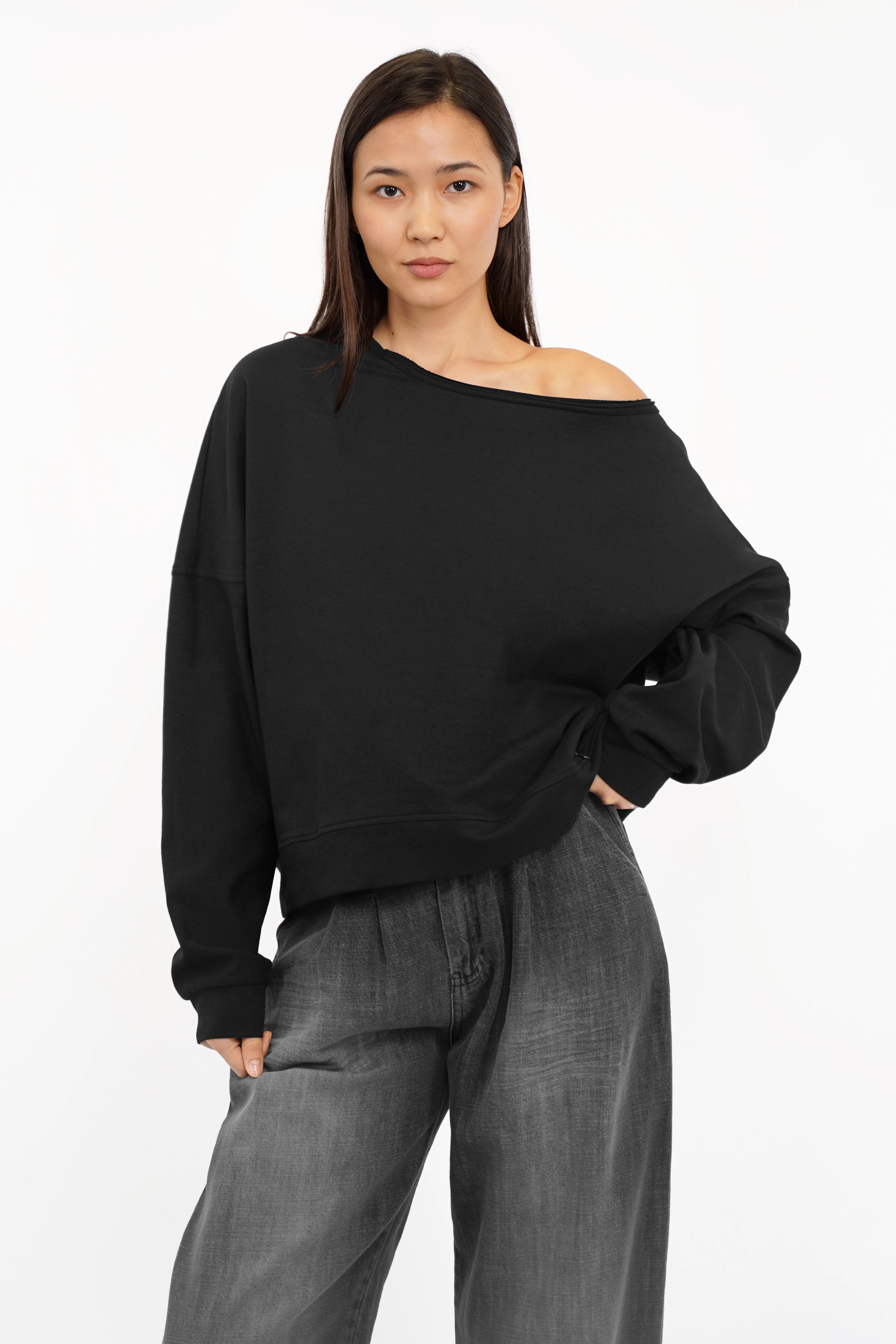 - Wide neckline with raw edges