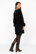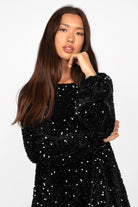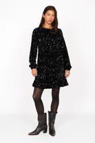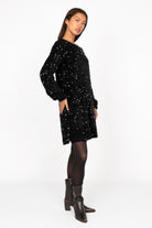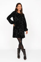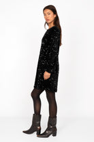 Festive dress made of sequined velvet with a loose A-line and long sleeves. With a round neckline and small opening at the back. The material is soft against the skin and comfortable to wear. Lined on the inside.