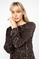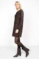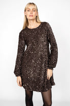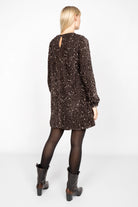 Festive dress made of sequined velvet with a loose A-line and long sleeves. With a round neckline and small opening at the back. The material is soft against the skin and comfortable to wear. Lined on the inside.