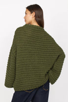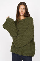 Chunky knit sweater with a wide, almost boxy silhouette. The design is characterized by a round neckline, dropped shoulders, straight sleeves and open cuffs. The voluminous chunky knit makes it a statement piece for chilly days.