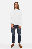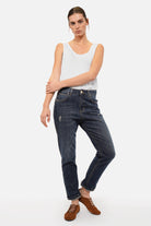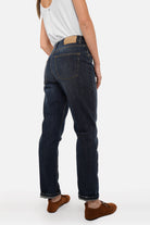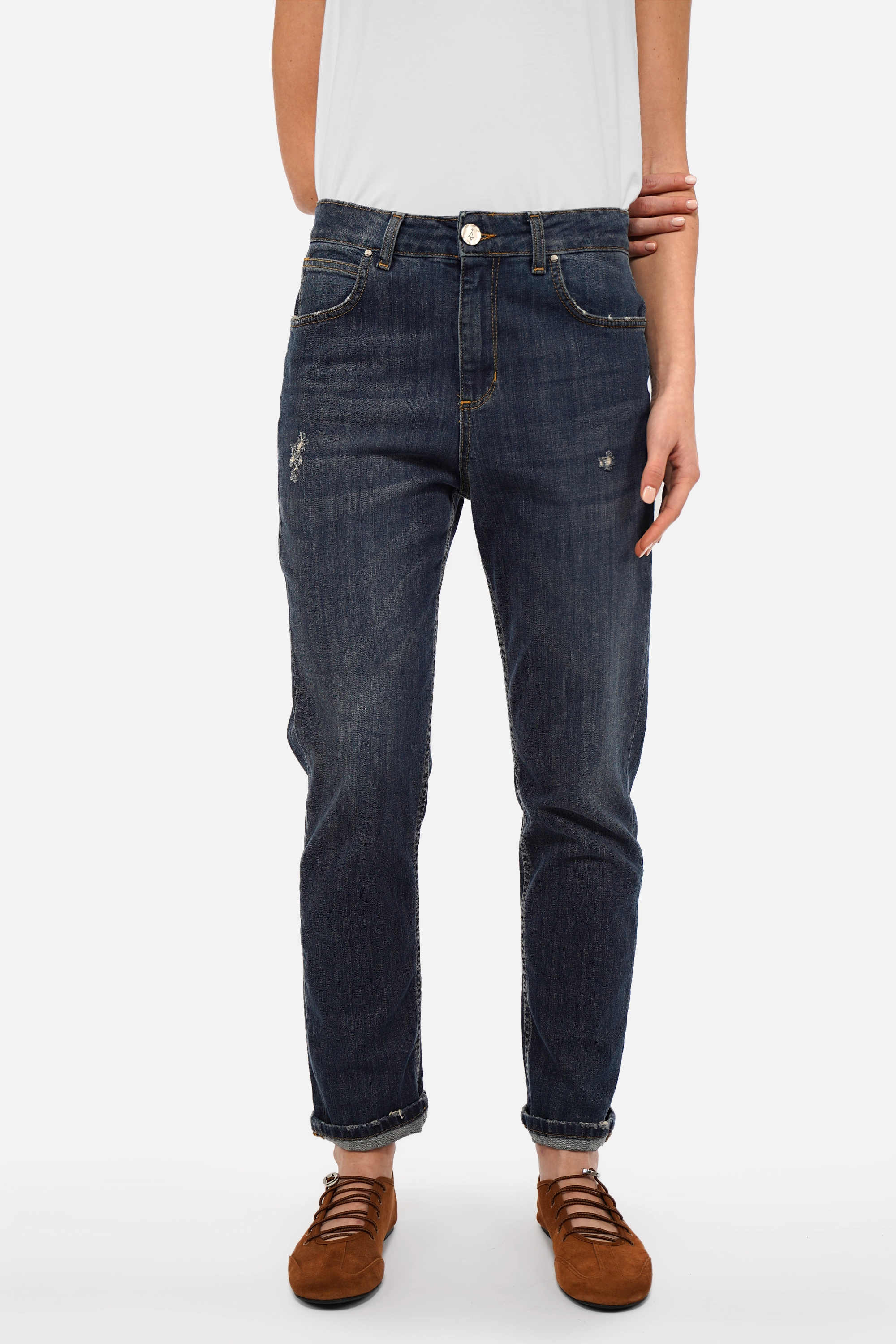 Un jean boyfriend avec délavage bleu foncé. Coupe ample, jambe légèrement fuselée. Tu peux le porter soit décontracté, retroussé, soit long en toute simplicité.