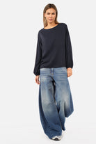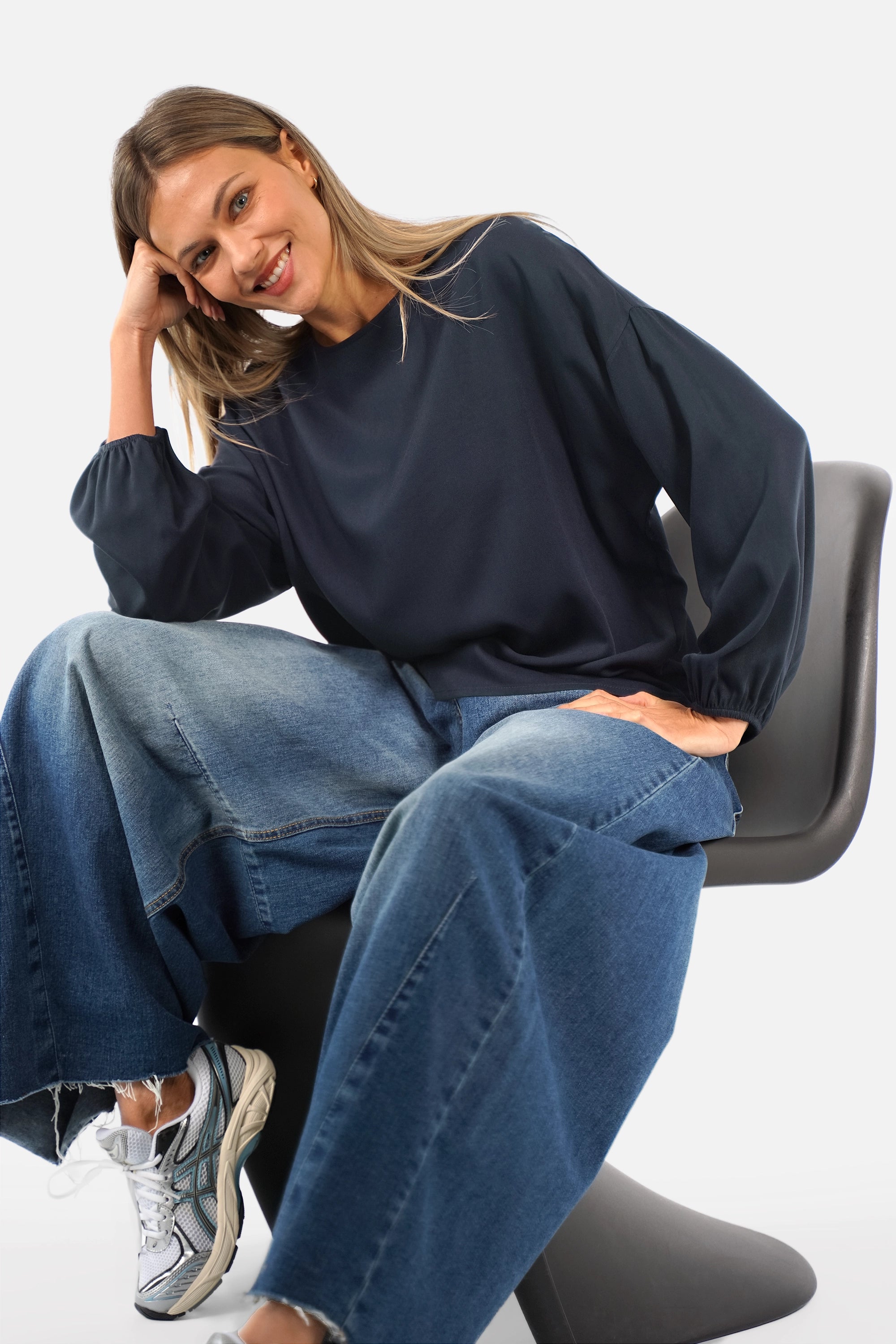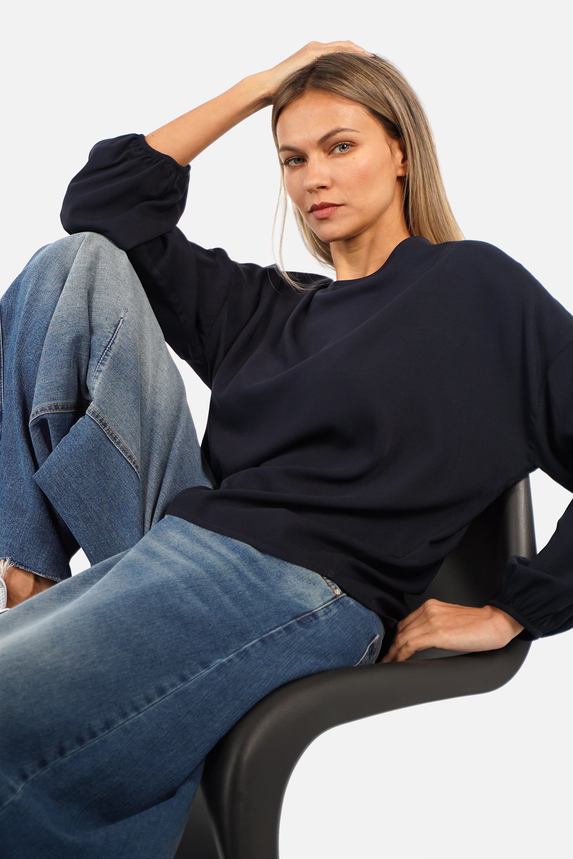 Blouse à enfiler à coupe ample avec encolure ronde, épaules tombantes et manches longues à finitions élastiquées. En fine viscose twill au tombé souple. À porter toute l’année.