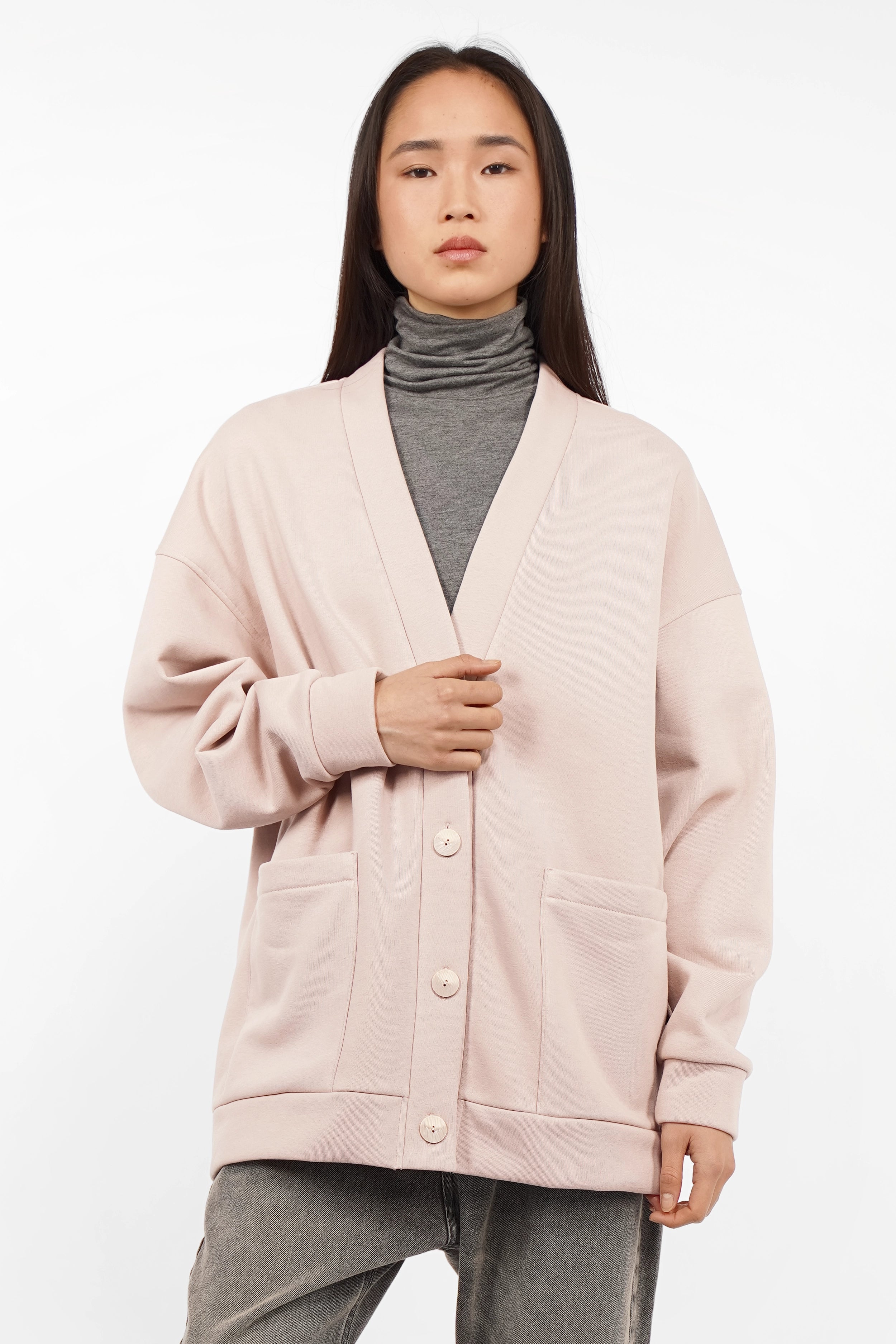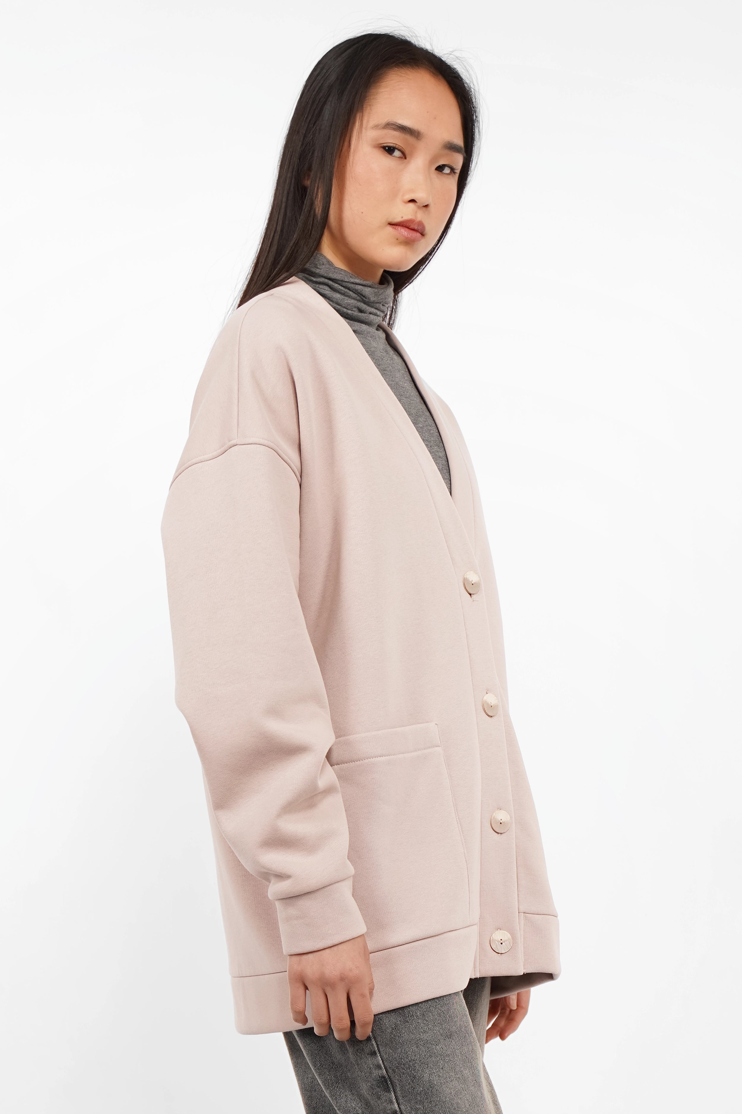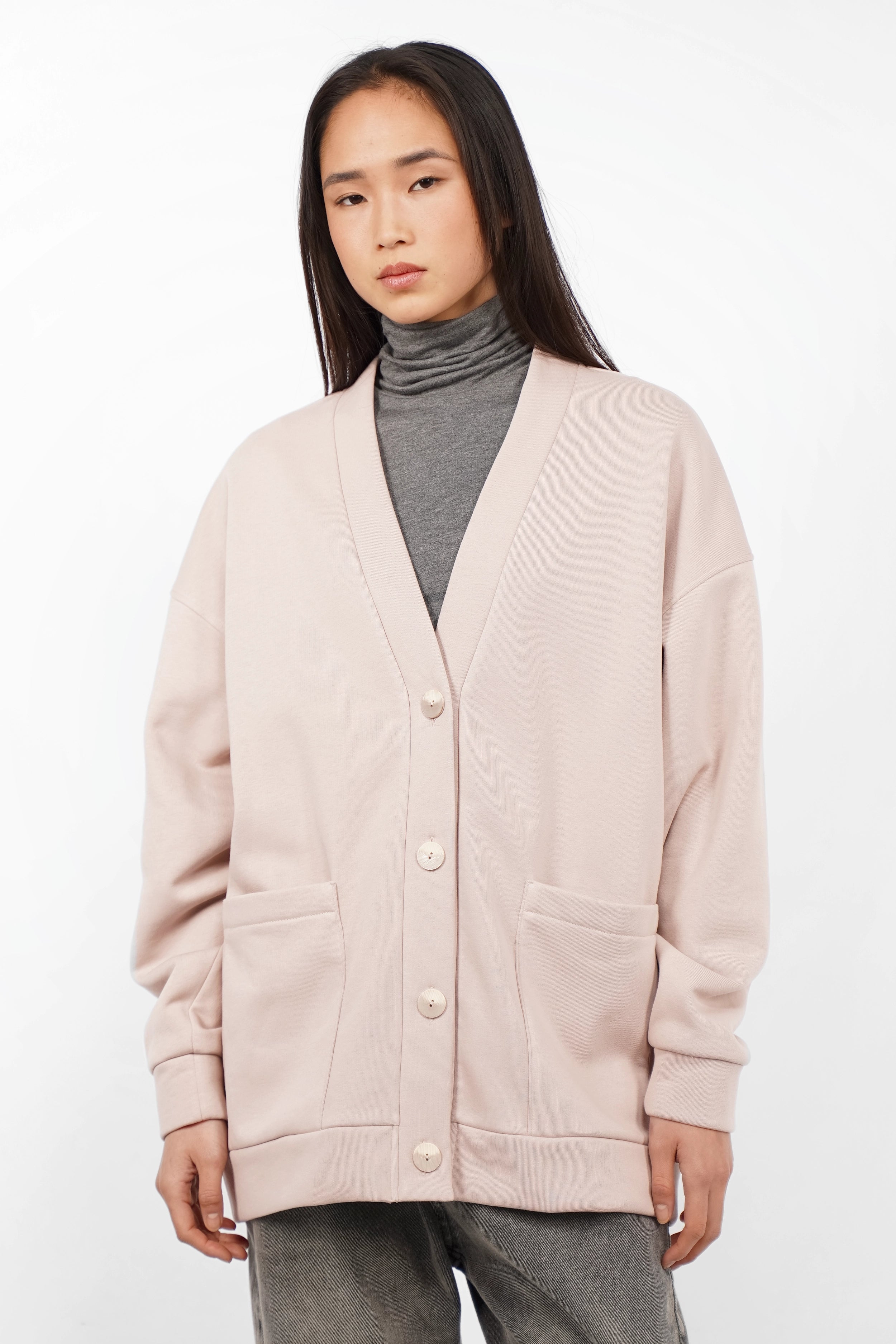 Ein Relaxed Fit Cardigan aus softem Sweat mit entspannter Linie. Die gebürstete Innenseite sorgt für ein angenehmes Tragegefühl. Lässt sich offen oder geschlossen tragen – solo oder als Layer.