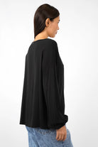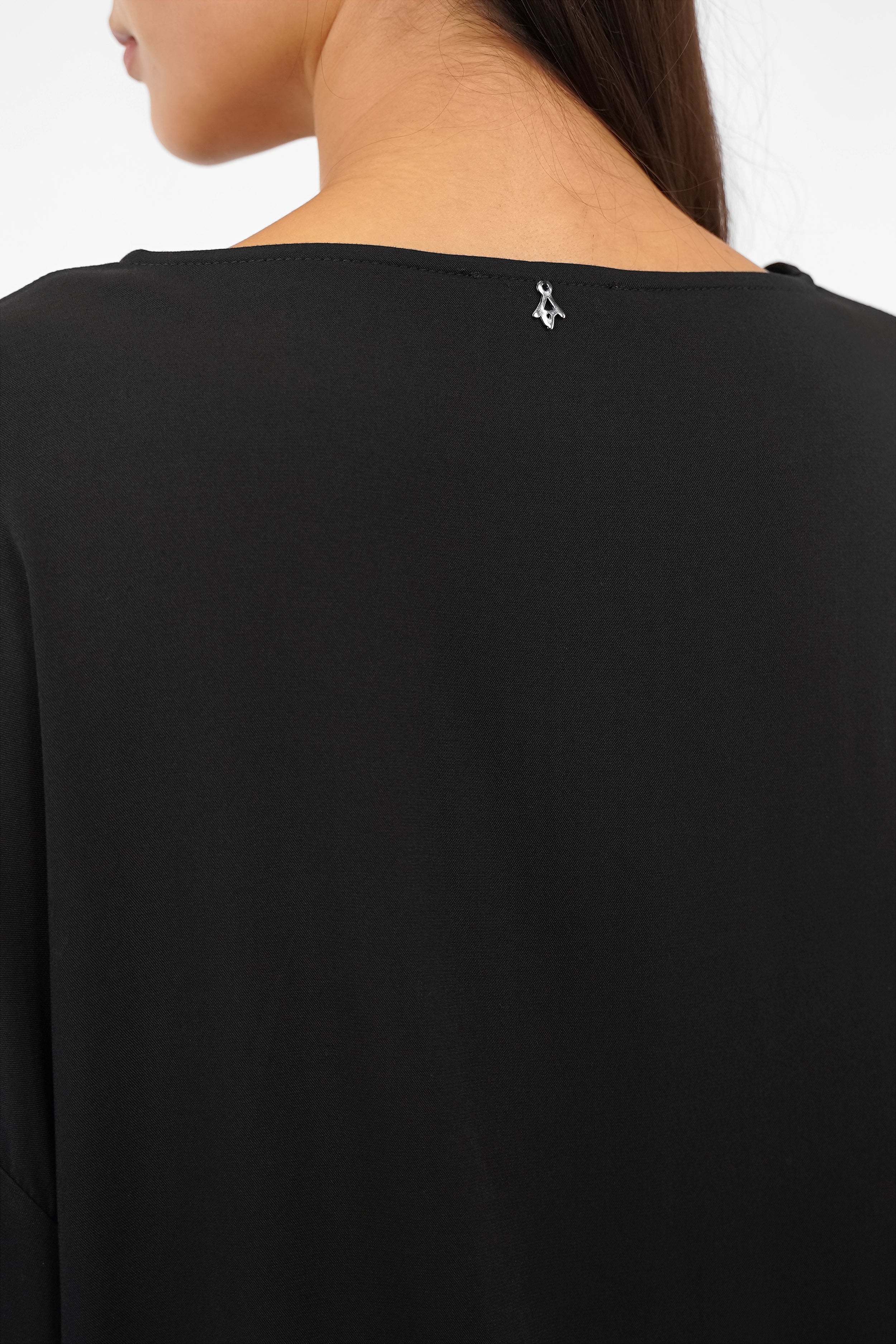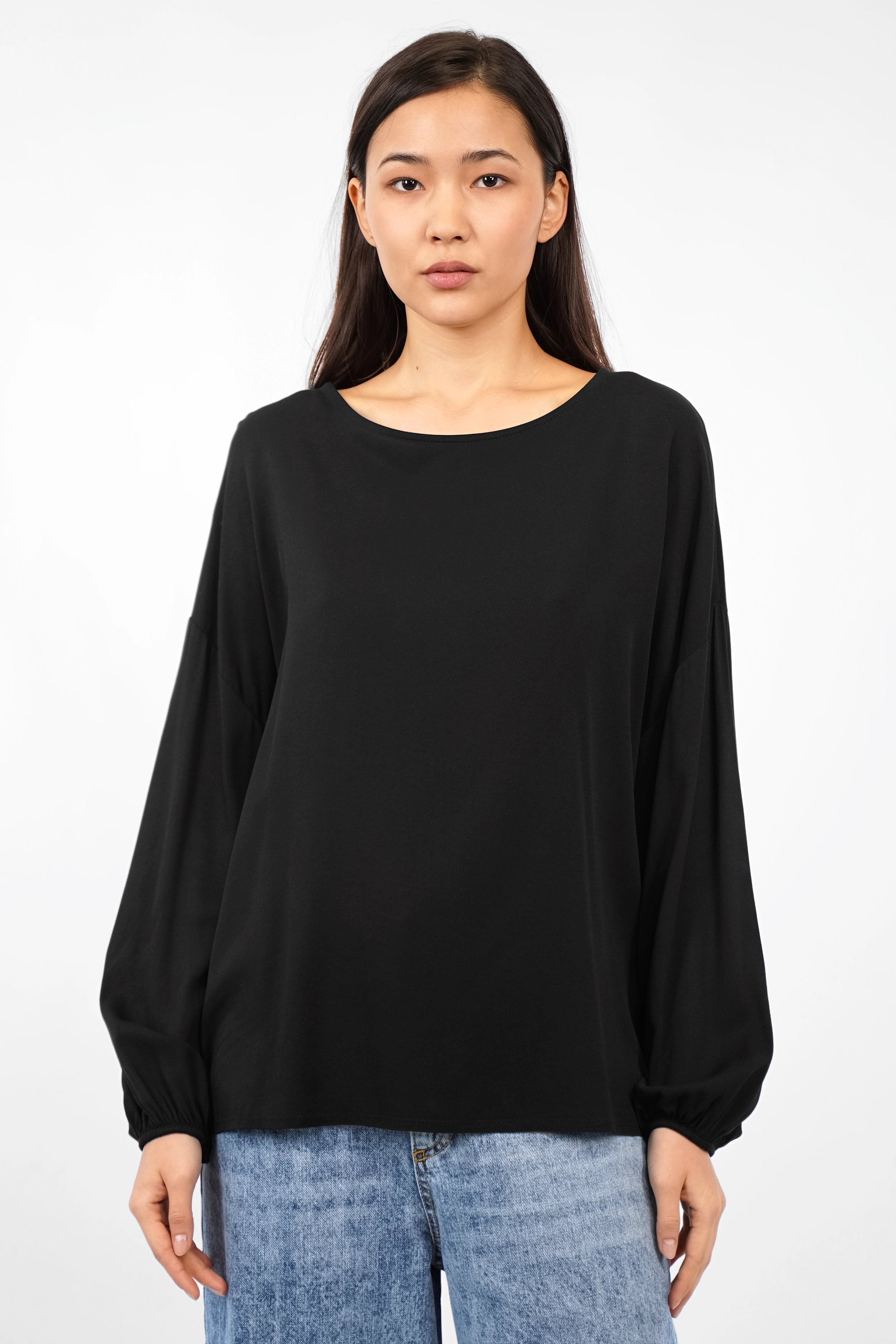 Locker geschnittene Schlupfbluse mit Rundhalsausschnitt, überschnittenen Schultern und langen Ärmeln mit elastischen Abschlüssen. Aus feiner Twill Viskose mit weichem Fall. Ganzjährig tragbar.
