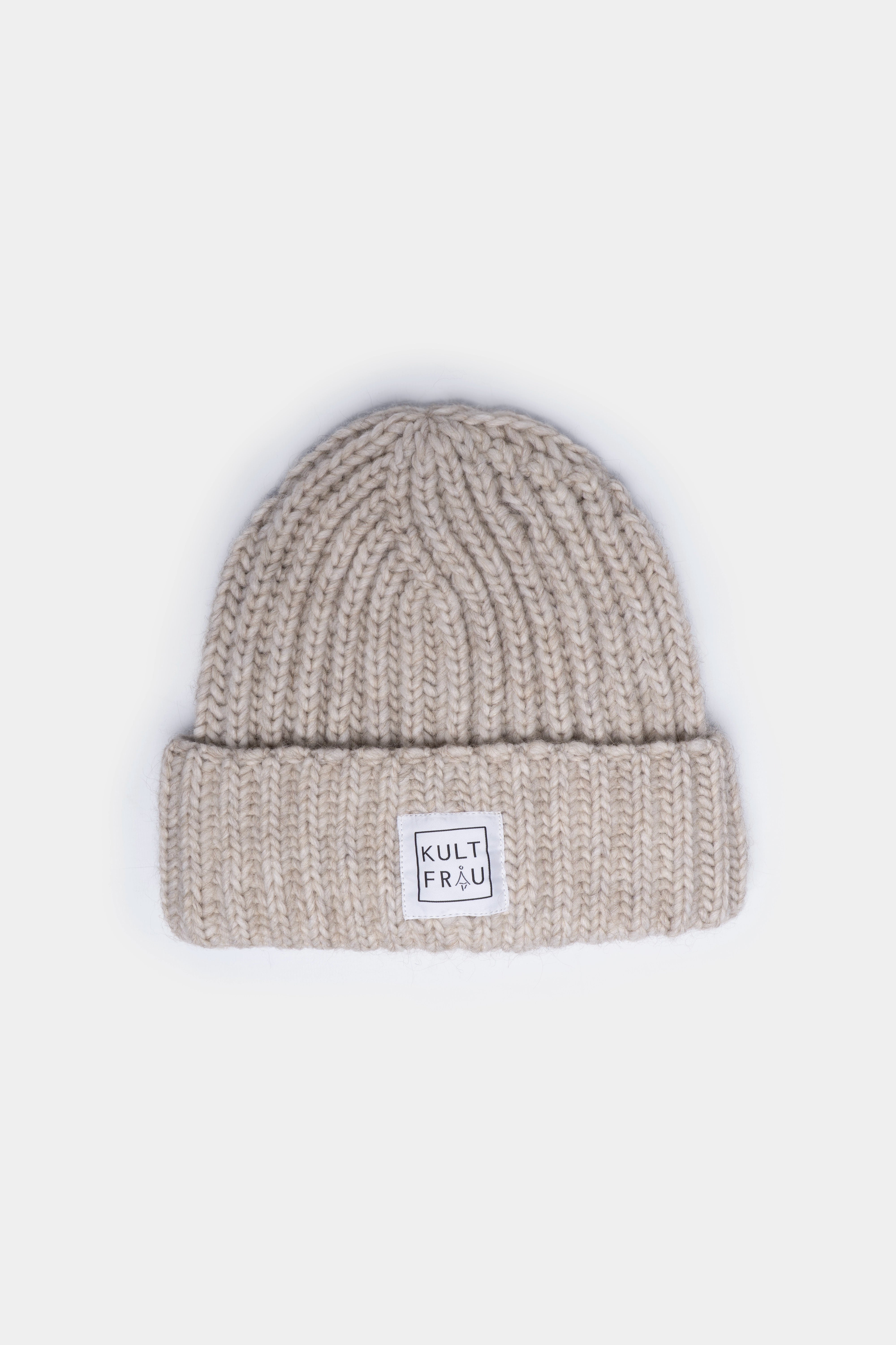 Diese Strickmütze ist aus einem Wollmix im groben Rippstrick gefertigt. Der breite Umschlag verleiht ihr eine klare Form, das Kultfrau-Logo auf der Vorderseite setzt einen schlichten Akzent. Das Material fühlt sich weich an, liegt angenehm auf der Haut und kratzt nicht.