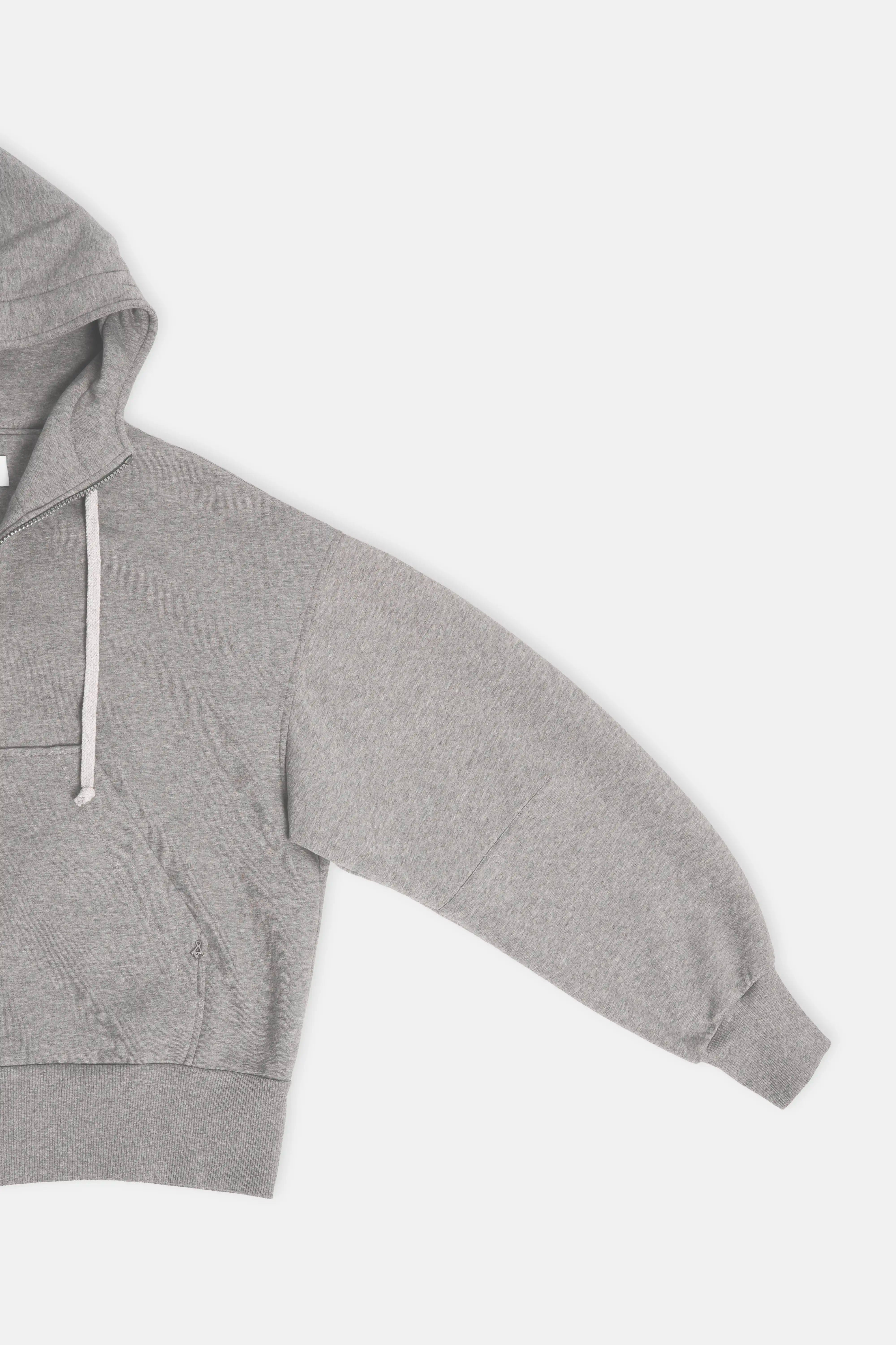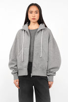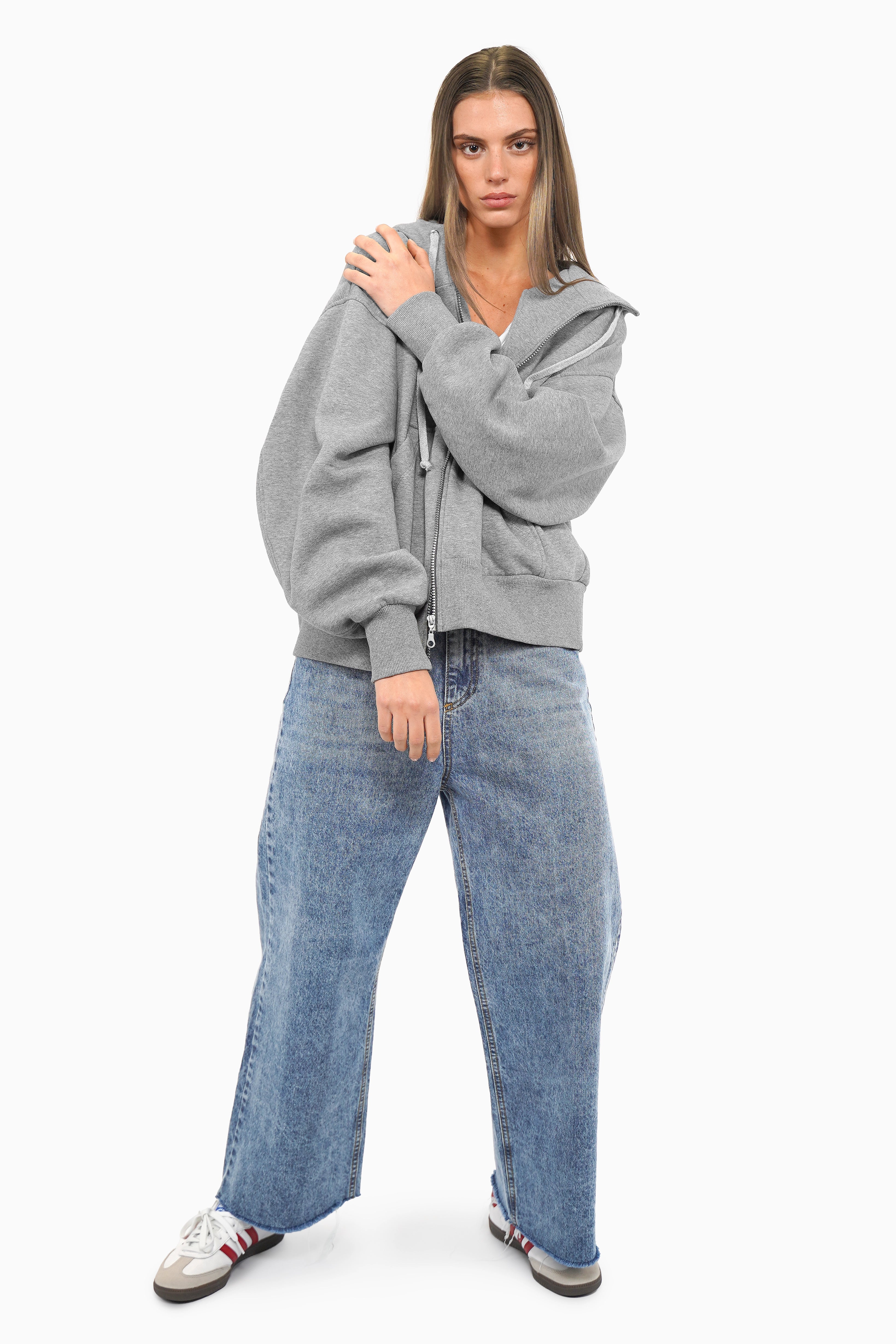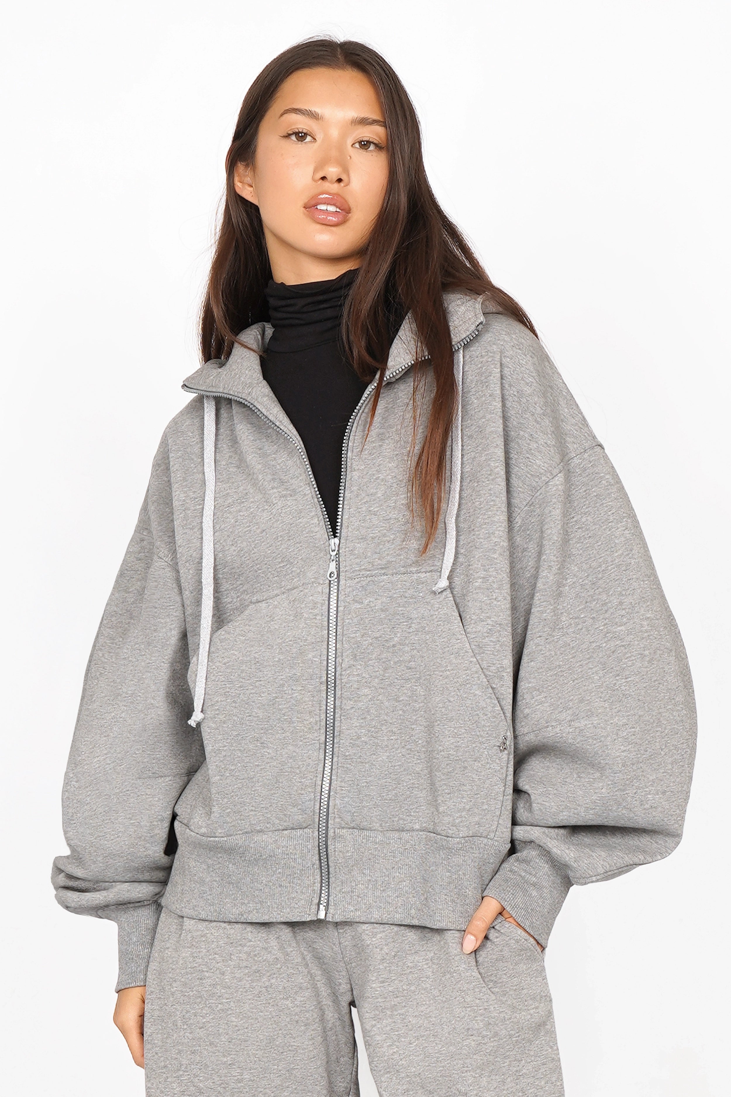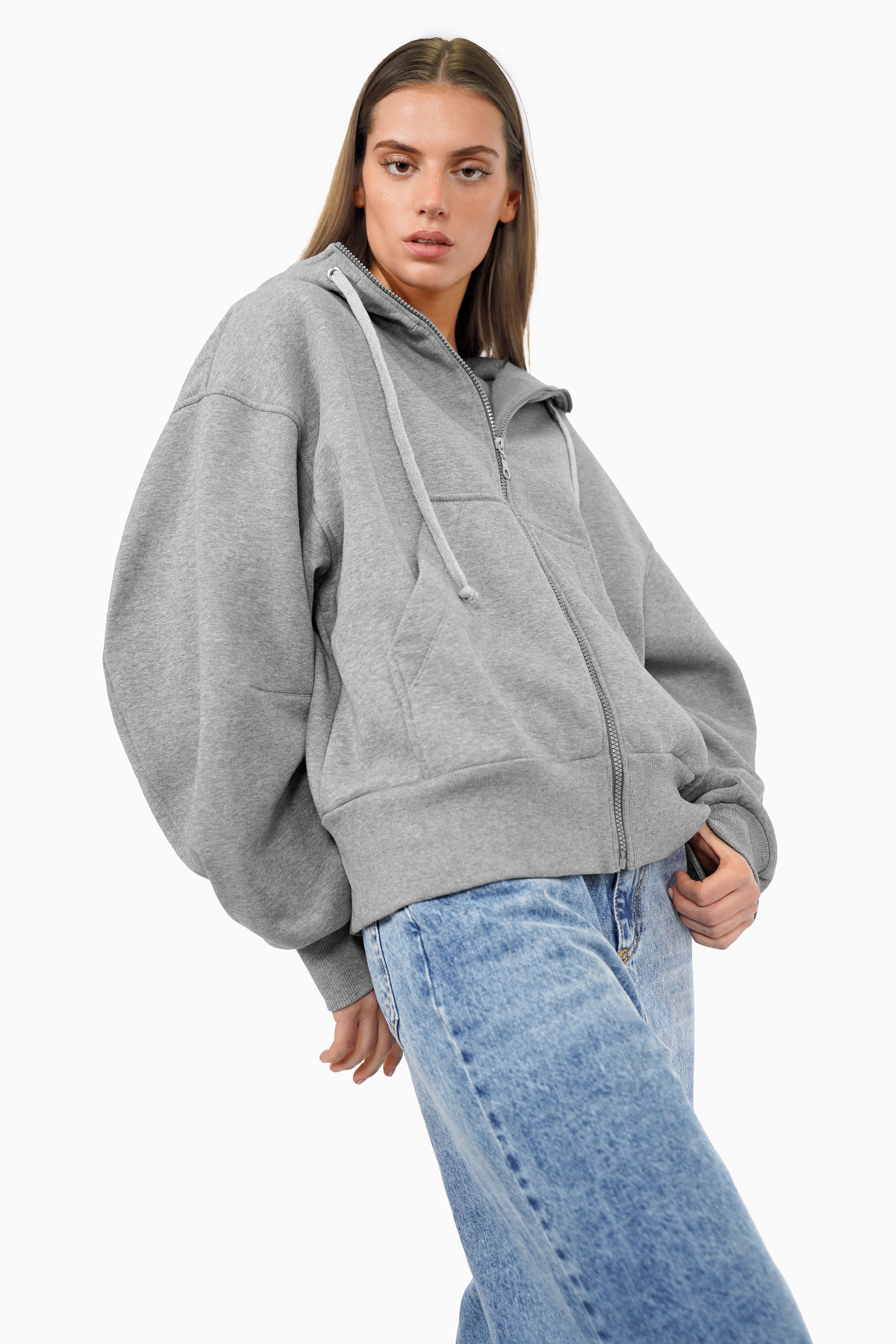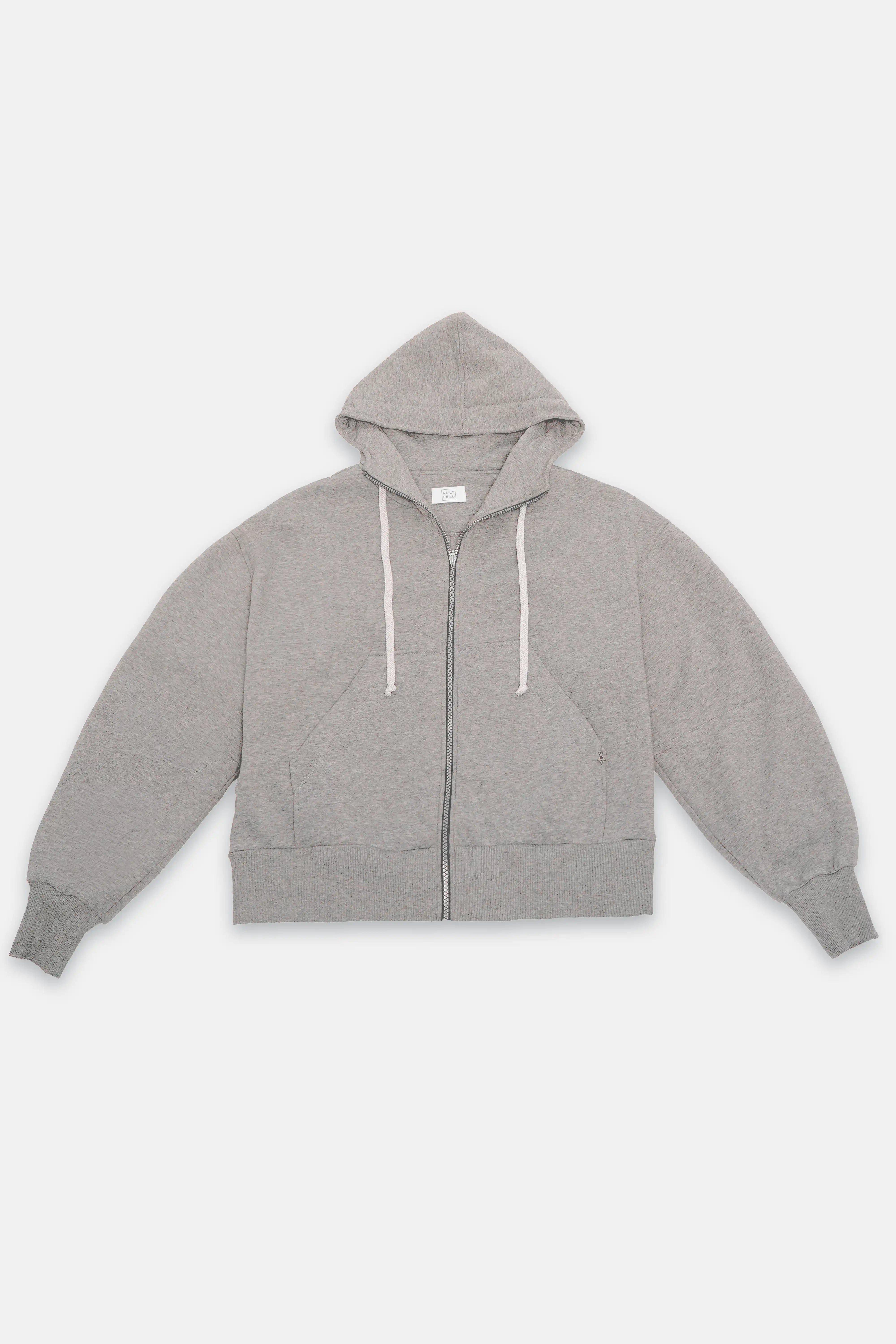 Ein Kapuzenpullover mit Reißverschluss in entspannter Passform. Überschnittene Schultern und voluminöse Sakeia-Ärmel mit breiten Rippbündchen geben ihm eine markante Form.