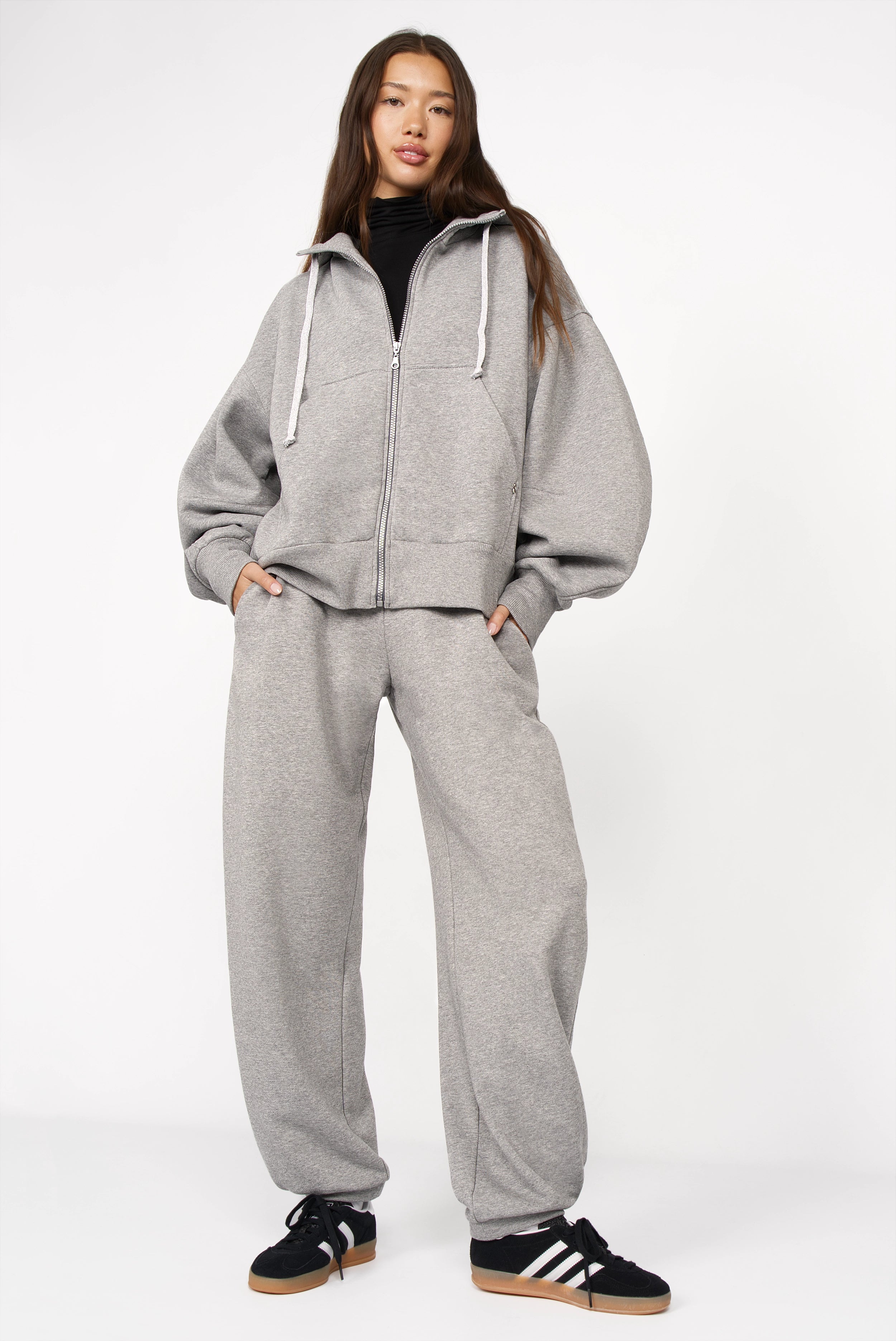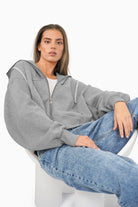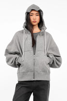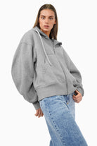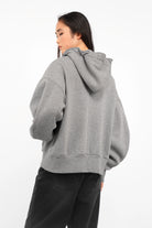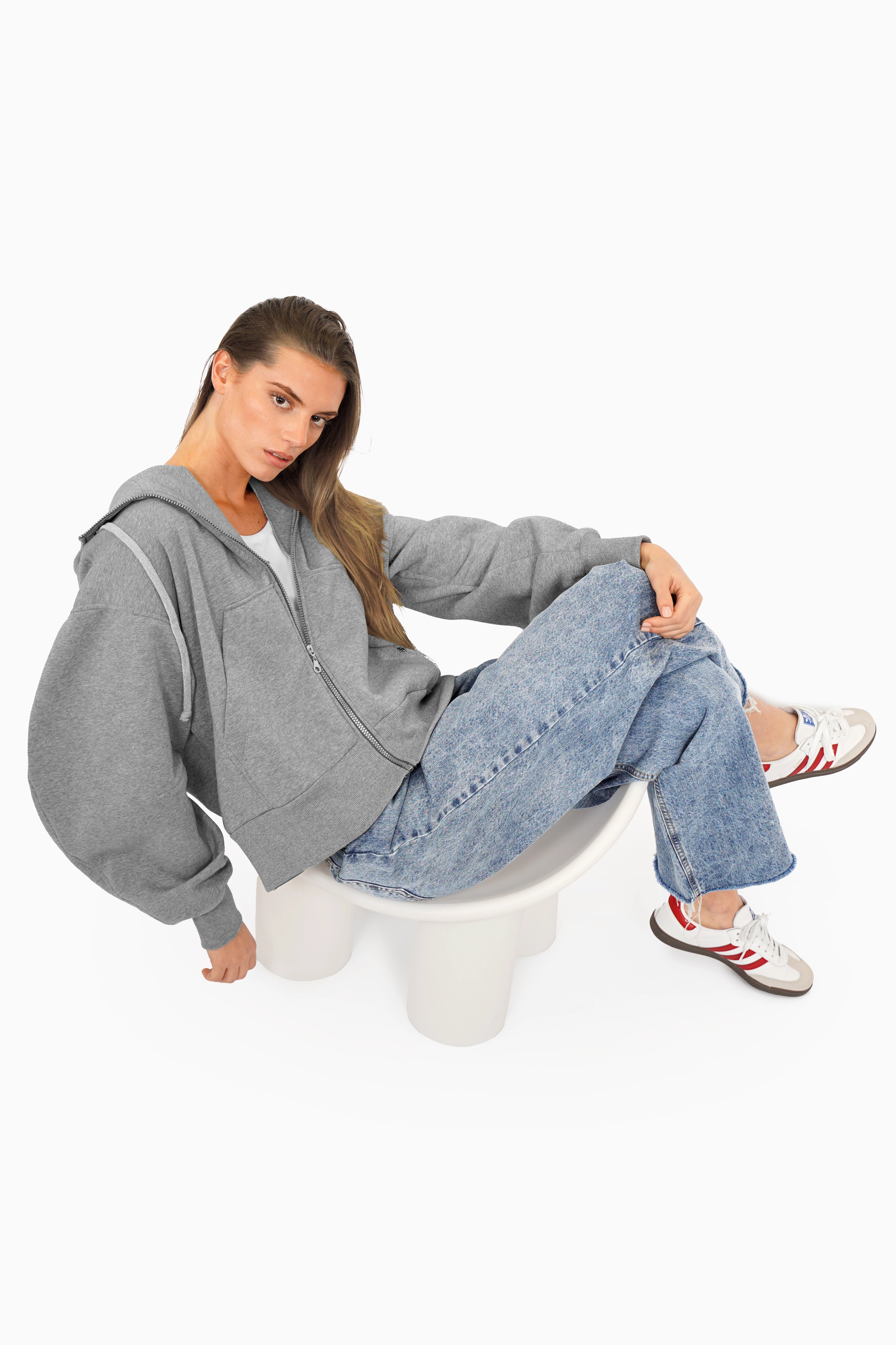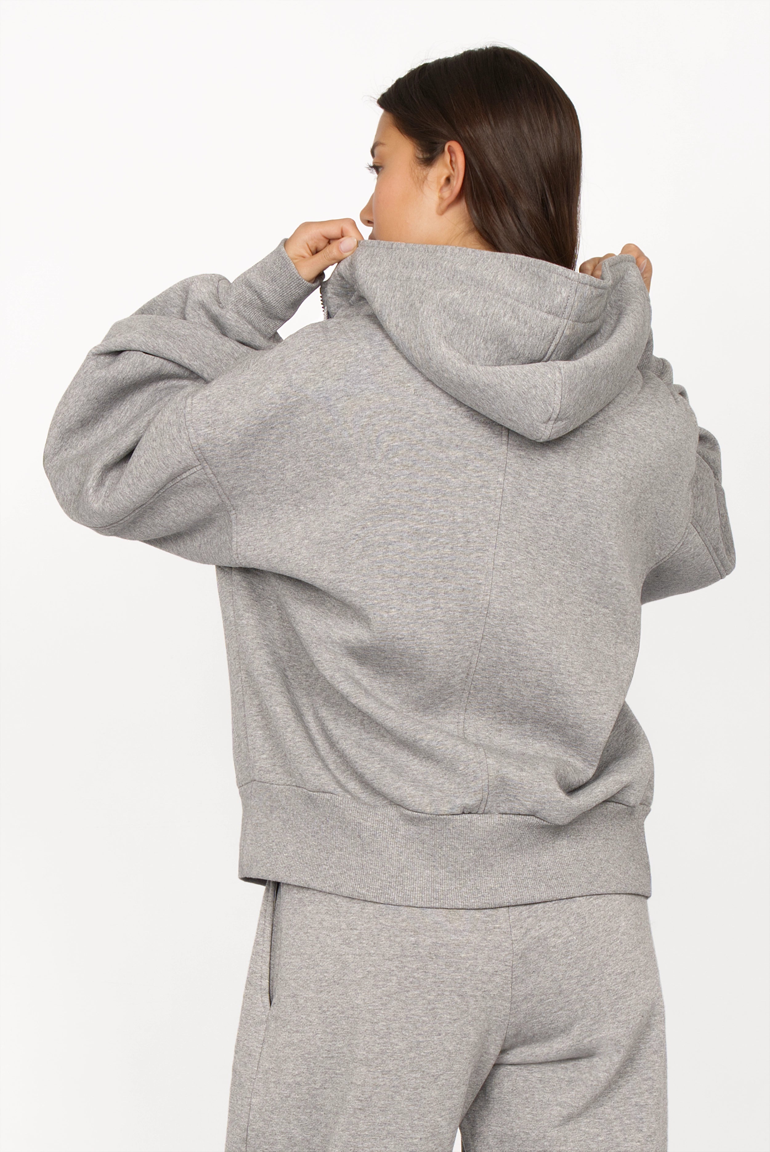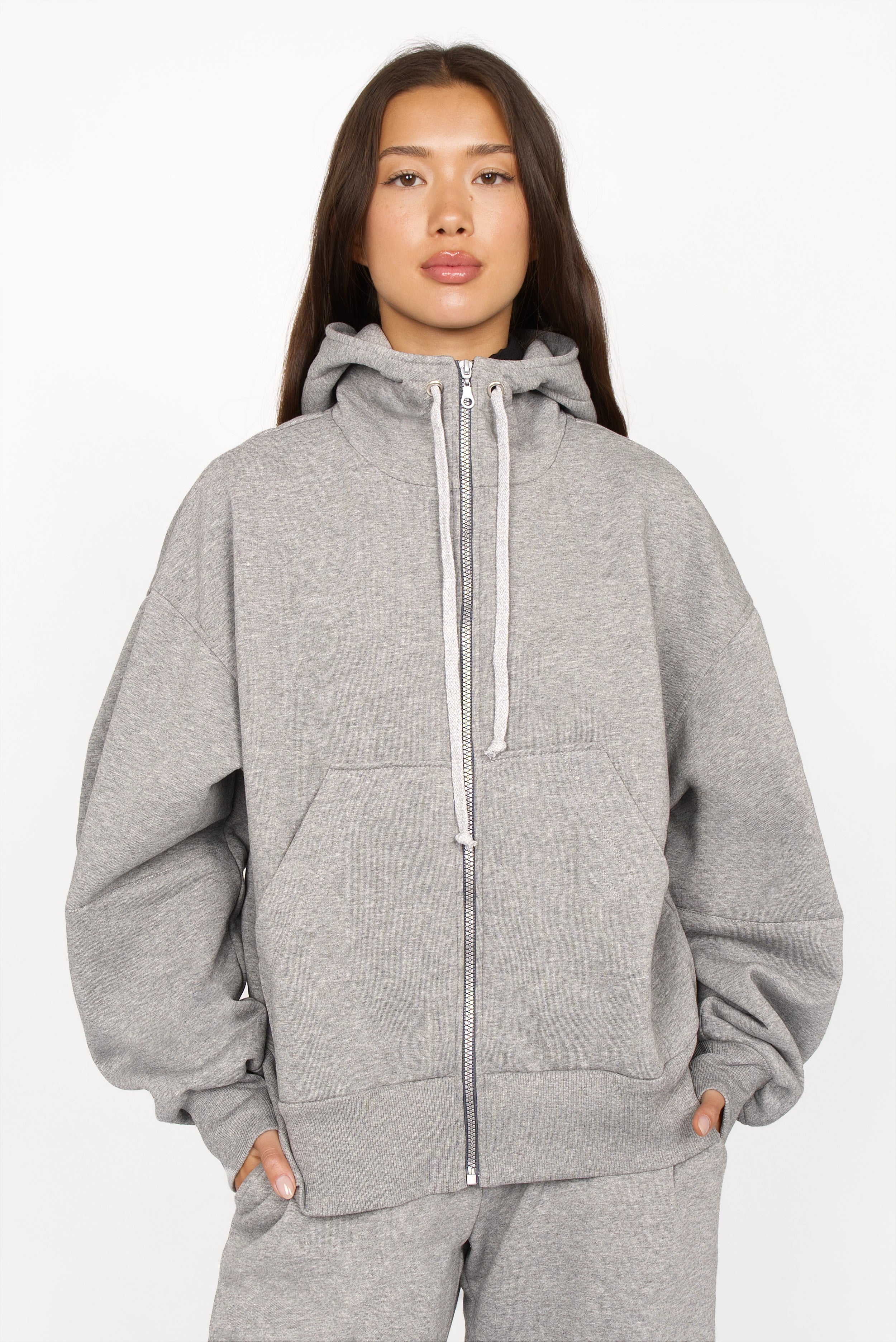Ein Kapuzenpullover mit Reißverschluss in entspannter Passform. Überschnittene Schultern und voluminöse Sakeia-Ärmel mit breiten Rippbündchen geben ihm eine markante Form.