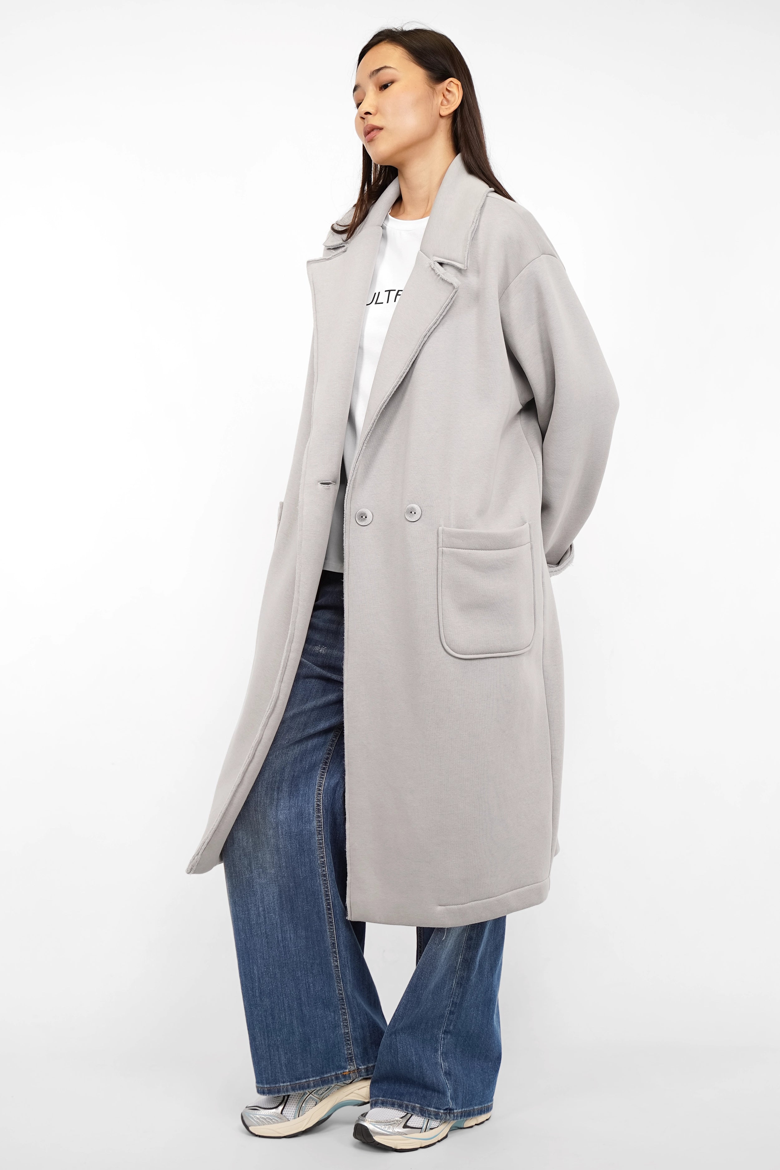 Dieser Oversize-Mantel aus weichem Jersey hat eine flauschig gebürstete Innenseite für hohen Tragekomfort. Offen geschnittene Kanten, große aufgesetzte Taschen und ein Reverskragen prägen das Design. Die Ärmel lassen sich umschlagen – der Abschluss ist innen glatt gearbeitet, sodass beim Umklappen keine gebürstete Innenseite sichtbar ist.