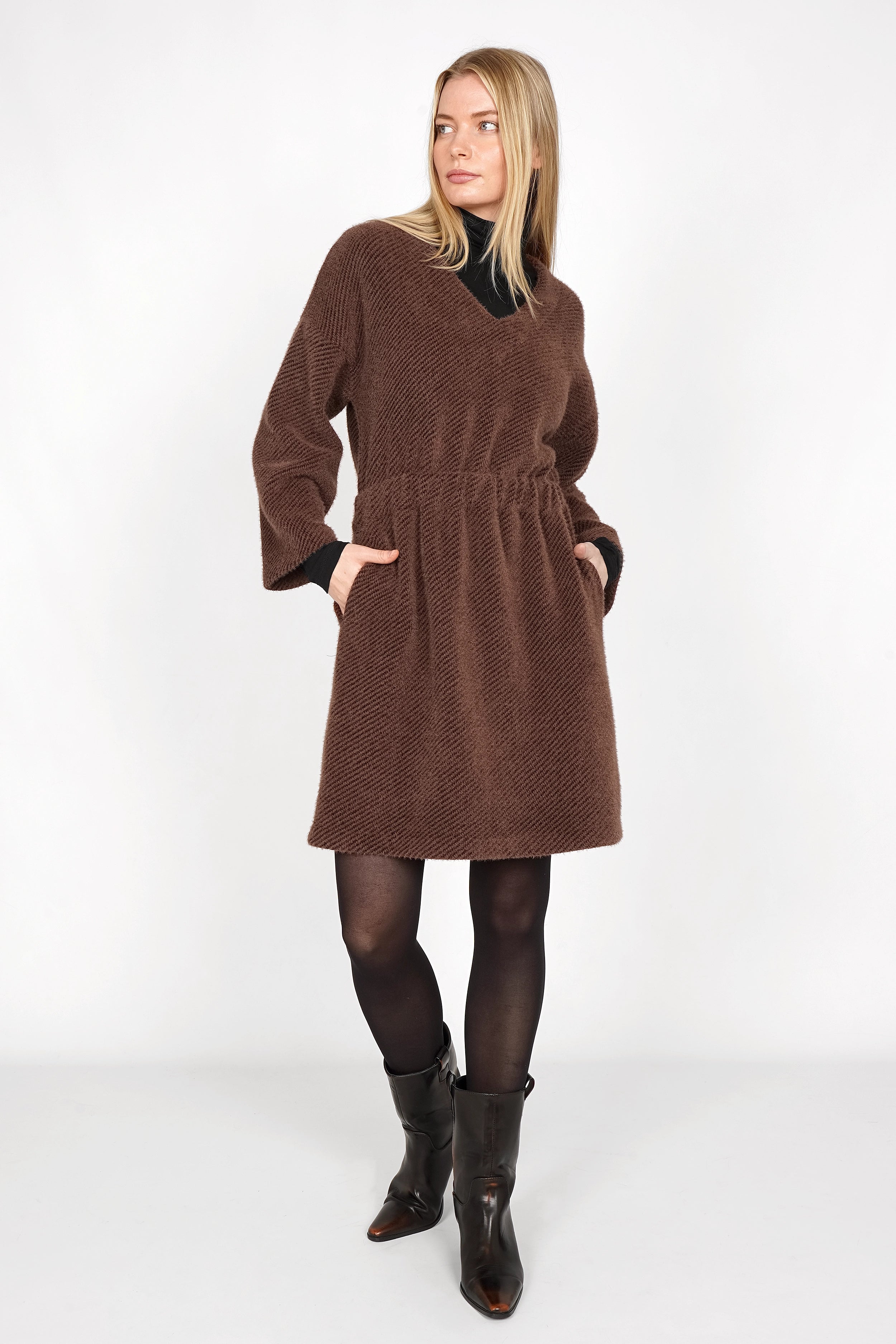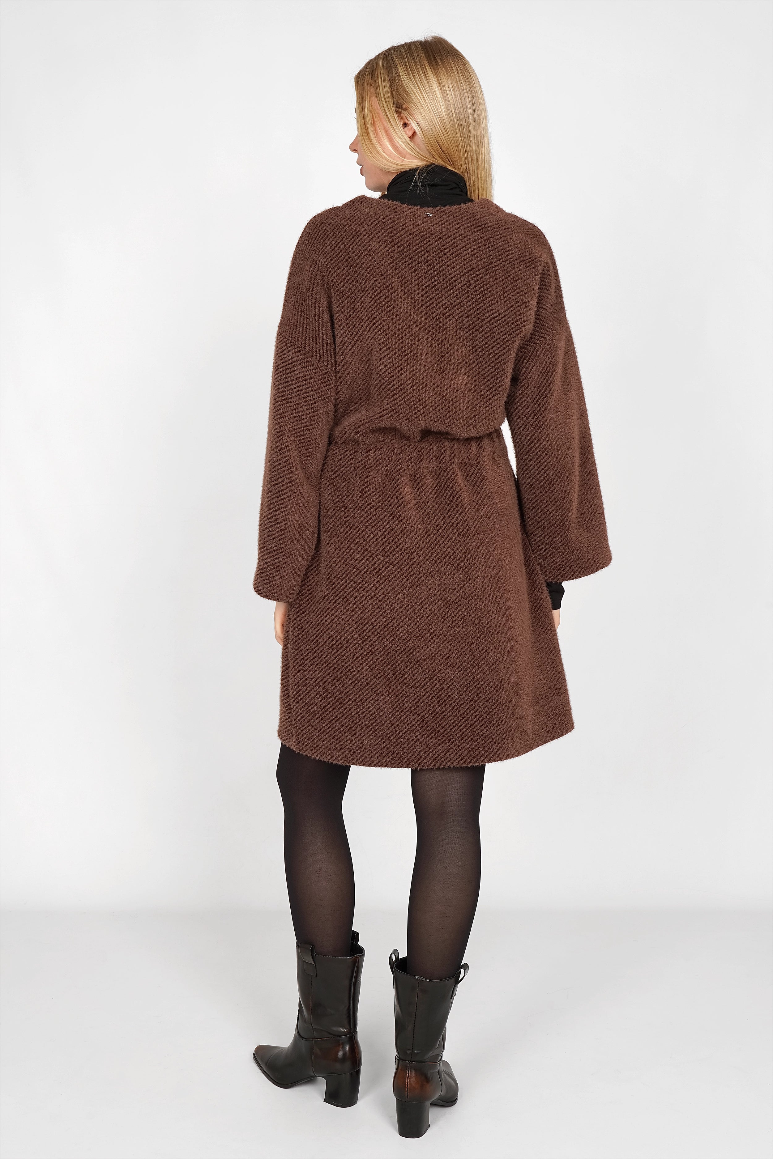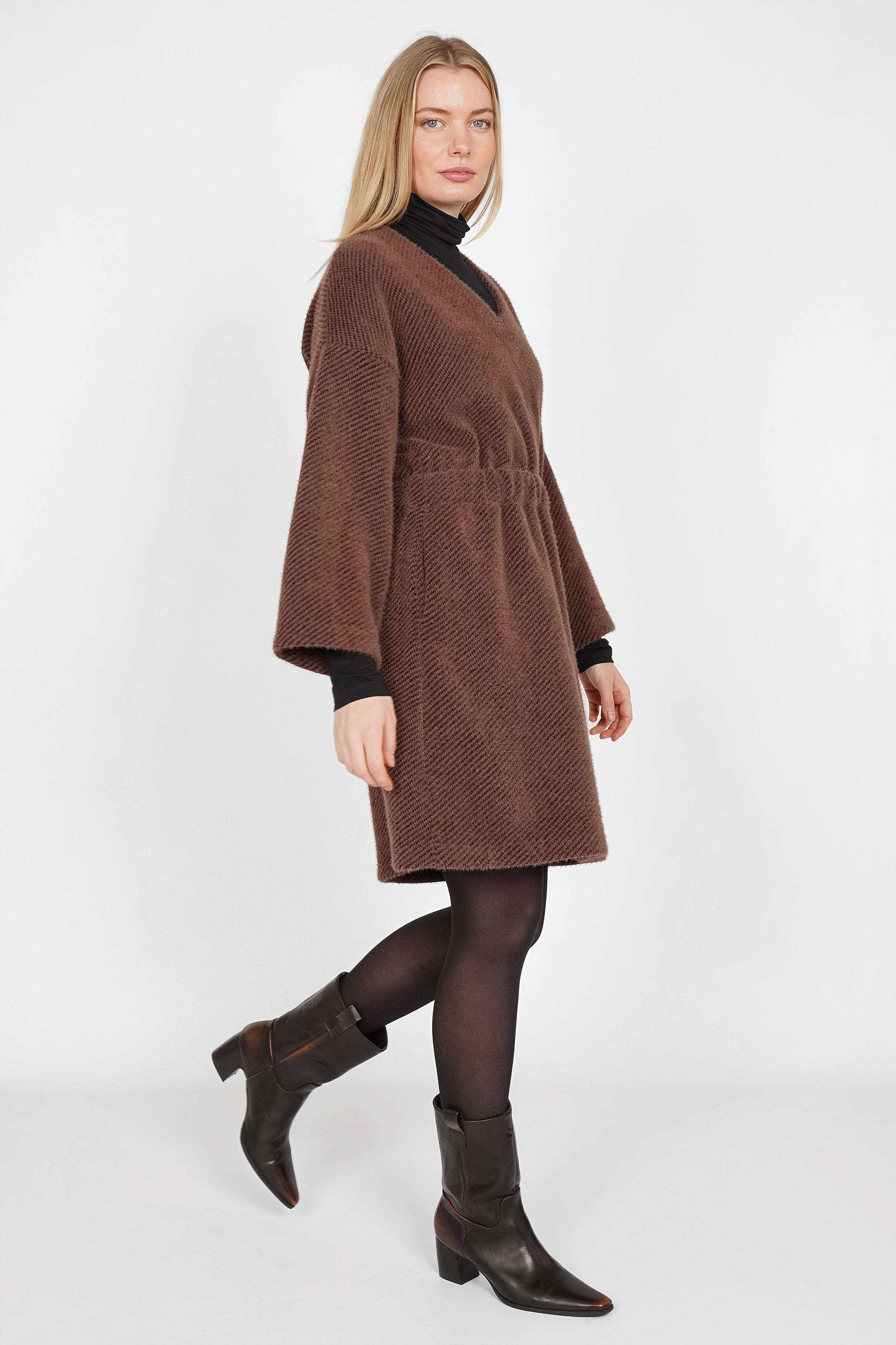 Ein Kleid mit klarer Silhouette und besonderem Material. Die flauschig strukturierte Oberfläche bestimmt den Look und macht das Kleid unverwechselbar.